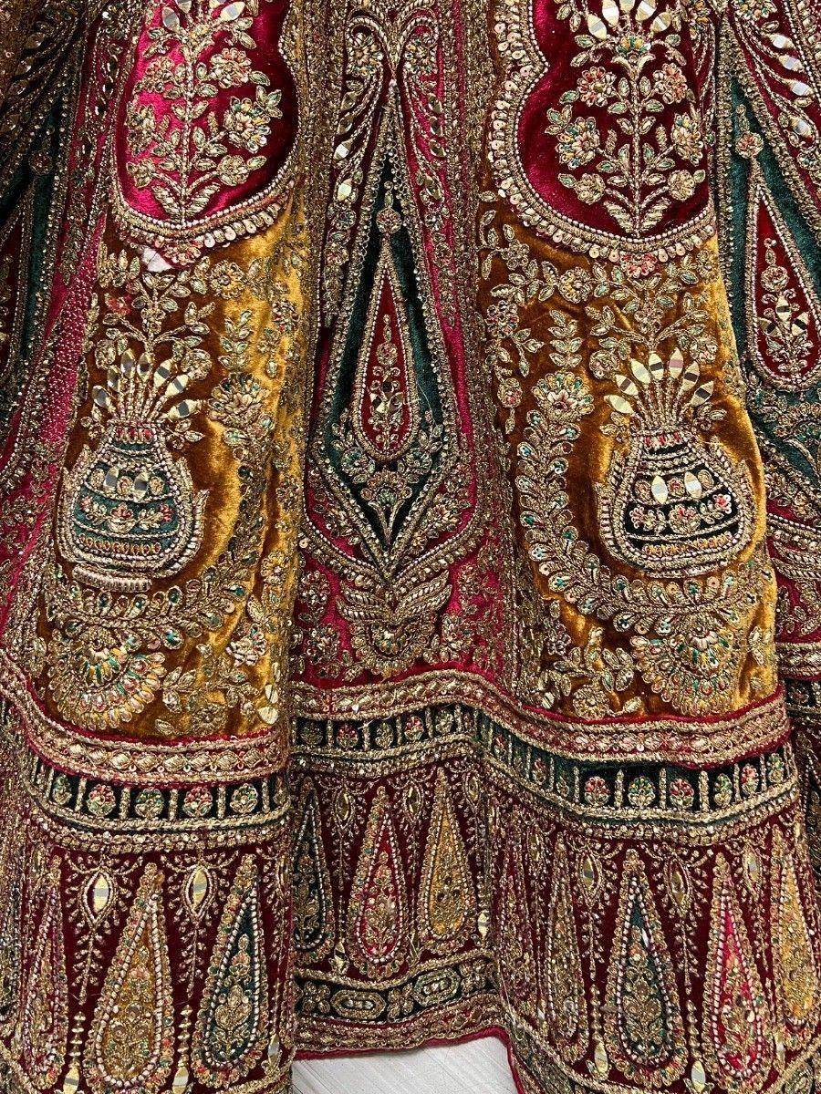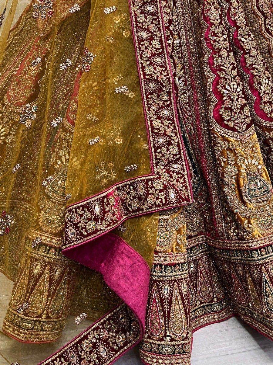 Introducing our stunning "lovely maroon embroidered velvet lehenga choli with double dupatta," a bridal ensemble that exudes elegance and grace. Crafted from maroon color velvet material, this lehenga is adorned with intricate mirror work, diamond motif work, zari work, and thread embroidery work, further embellished with sequin work and velvet patchwork.