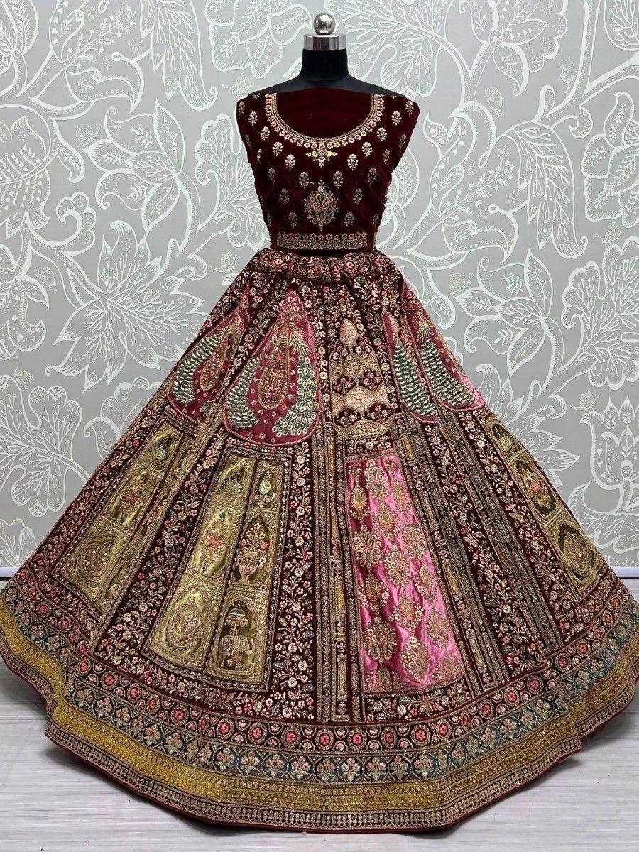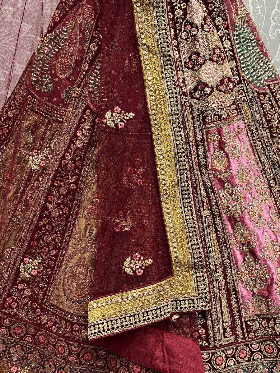 Introducing our lovely maroon threadwork velvet lehenga choli with soft net dupatta, a stunning bridal ensemble that will make you the center of attention on your special day. This exquisite lehenga features a maroon-colored velvet material that exudes elegance and sophistication.