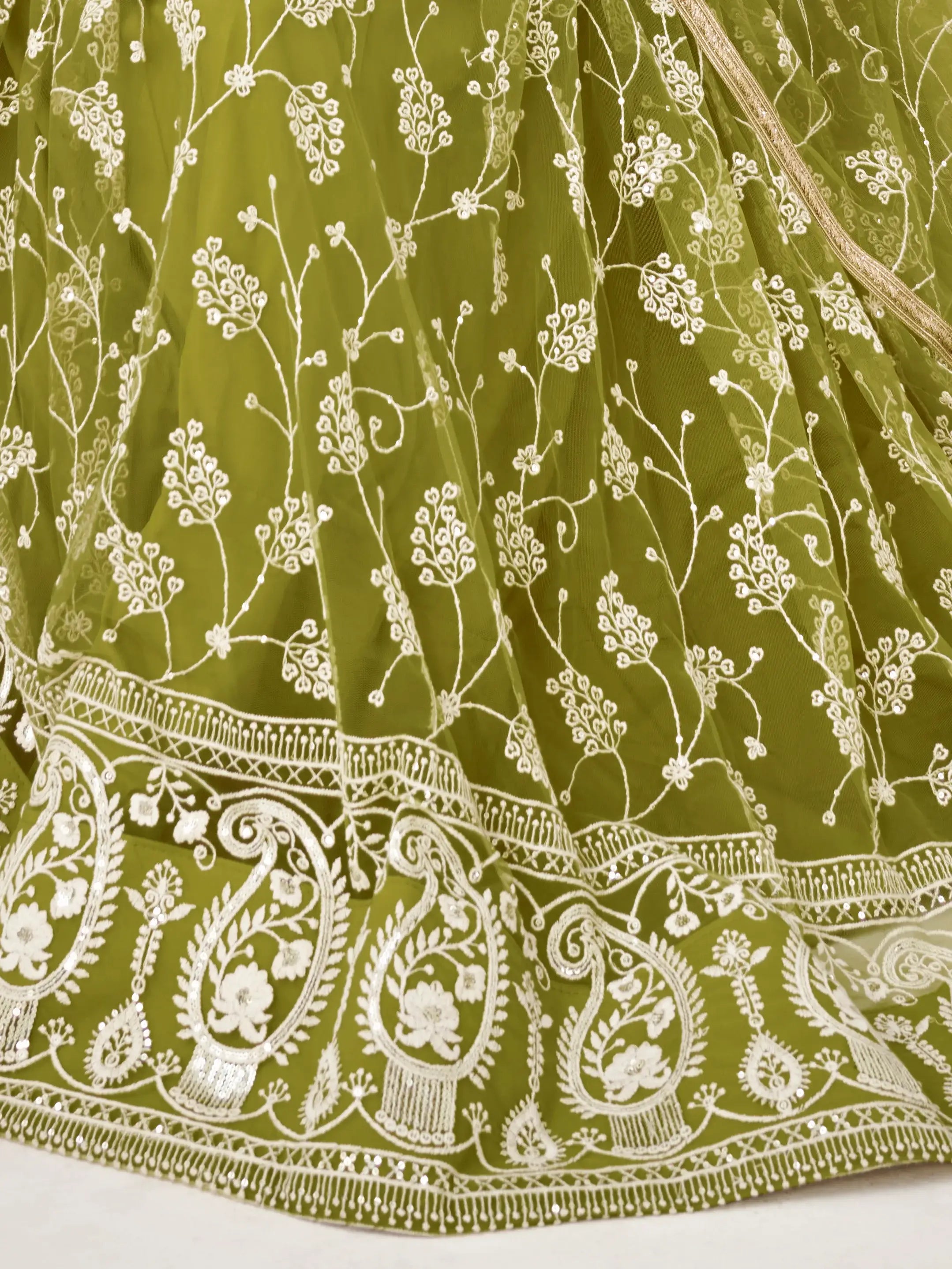 Present an energetic highlight to your ethnic attire by donning the Lovely Olive Green Butterfly Net Lehenga Choli. This stunning lehenga choli is designed to make you stand out and capture everyone's attention at any formal occasion, whether it be a wedding, evening party, festival, or marriage ceremony.