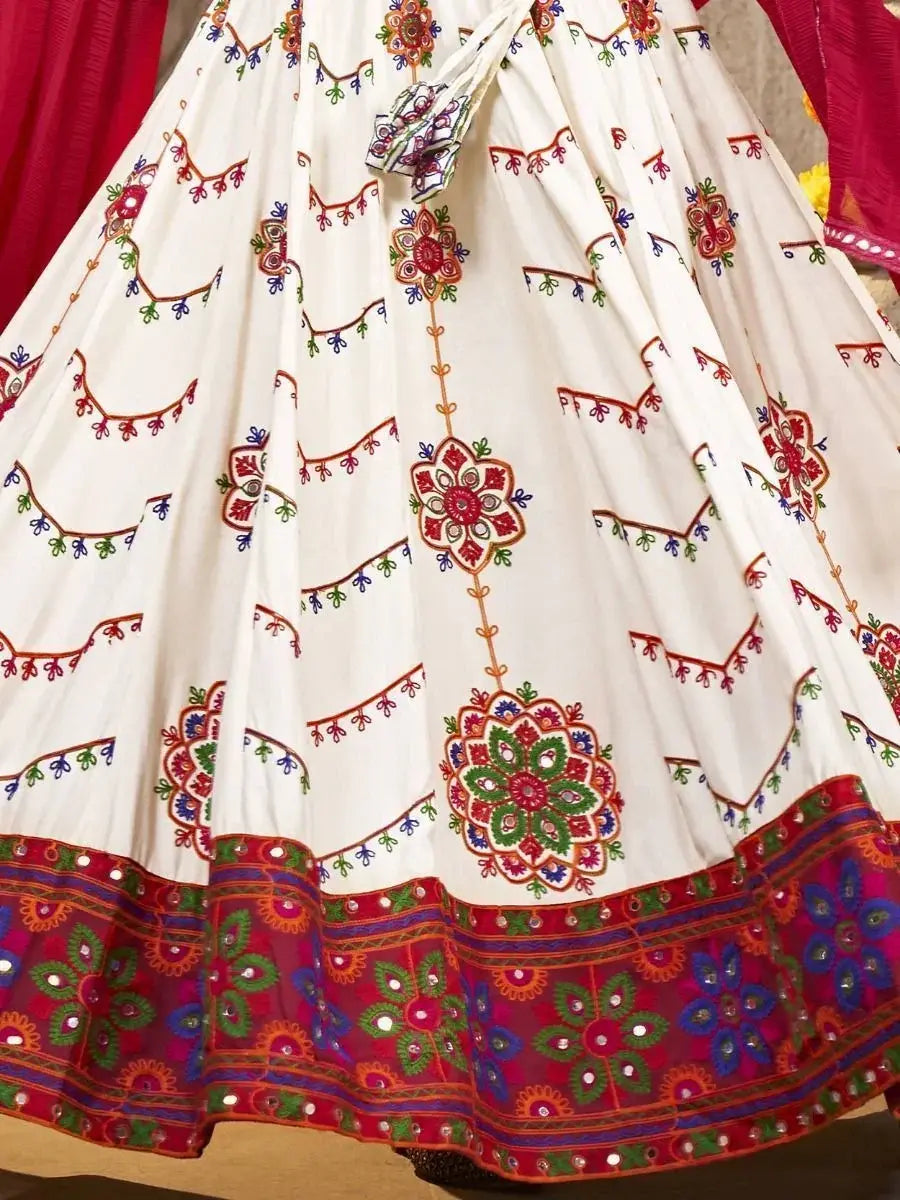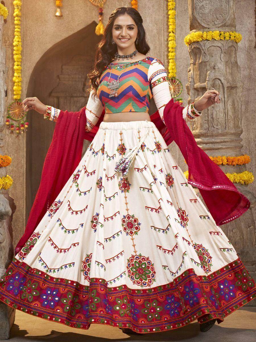 Are you ready to dazzle the world with your impeccable style this Navaratri? Look no further than this Lovely Pearl White Embroidered Rayon Navaratri Wear Lehenga Choli. It not only exudes grace and elegance but also showcases your love for traditional Indian fashion.
