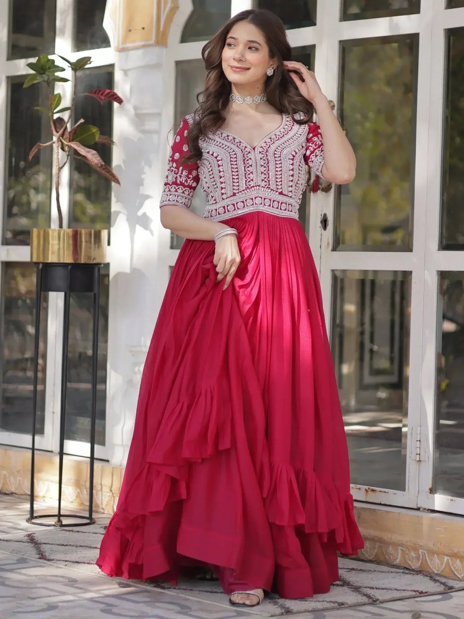 Glamorous Red Zari Embroidered Georgette Anarkali Gown With Dupatta