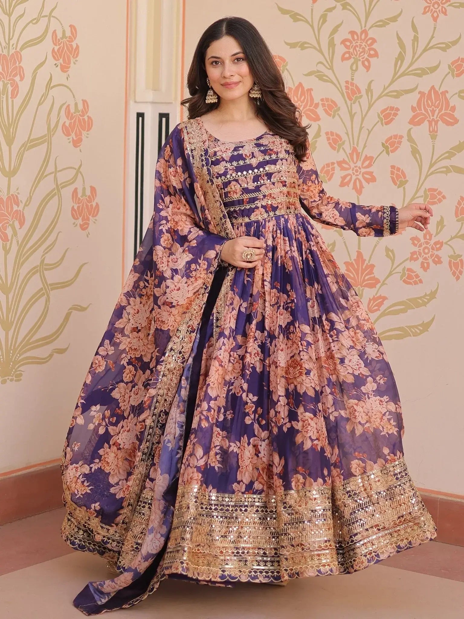 This stunning purple gown is crafted from premium Russian silk with a luxurious digital floral print. Adorned with intricate embroidered sequin work, it radiates elegance and festive charm.