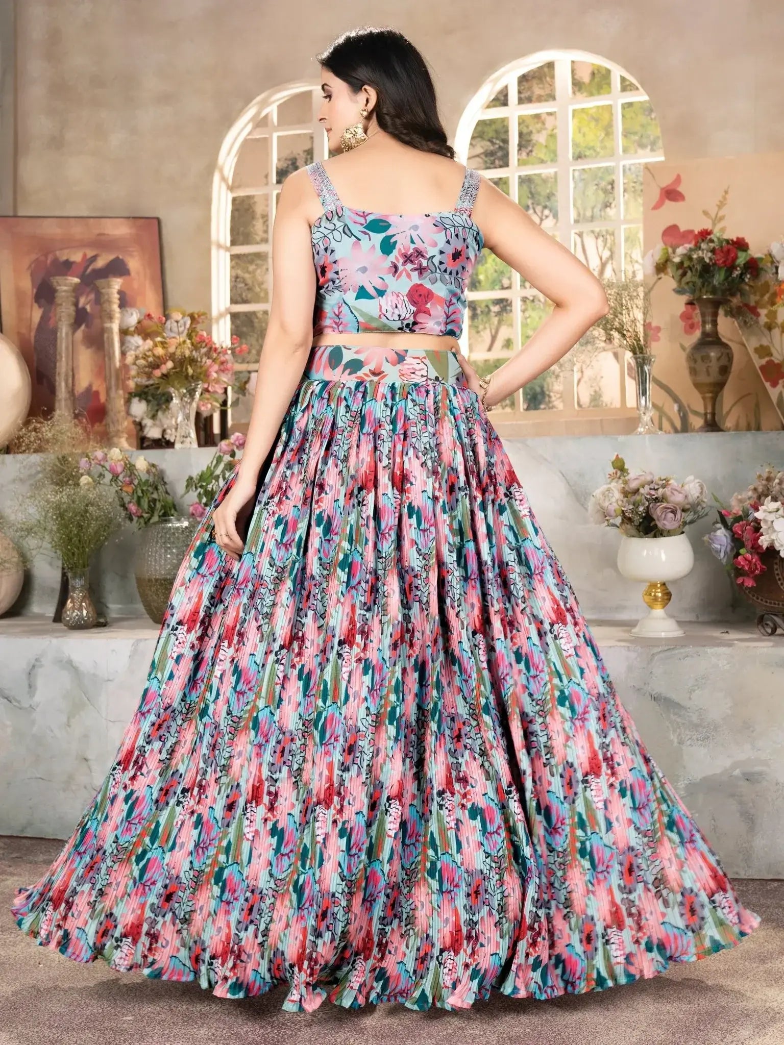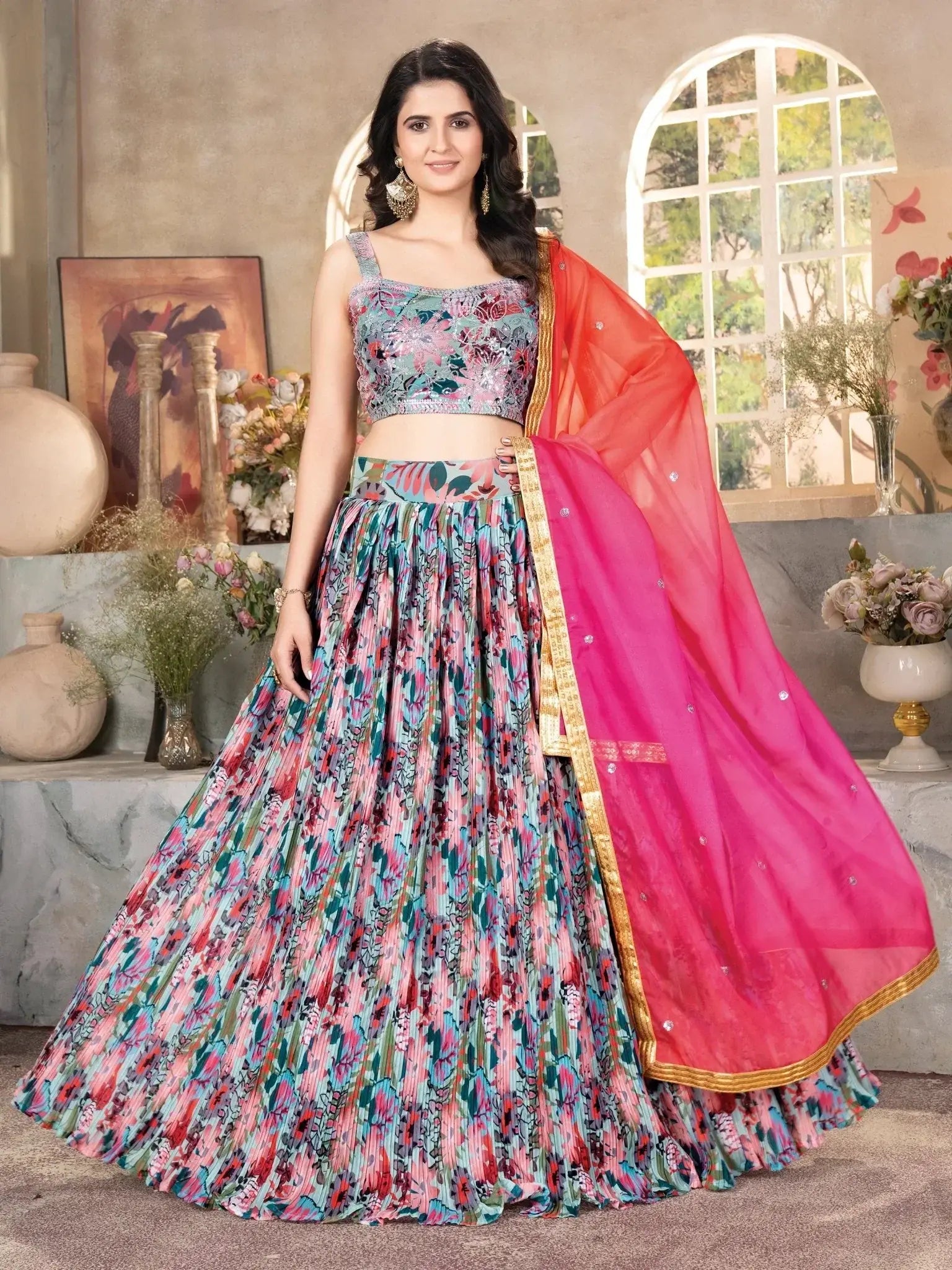This beautiful ensemble features a sea green organza crushed pattern lehenga with intricate digital print work, paired with a matching organza choli adorned with floral print work, sequin, and zari embroidery. The look is completed with a pink organza dupatta featuring thread embroidery, sequin work, and a designer lace border.