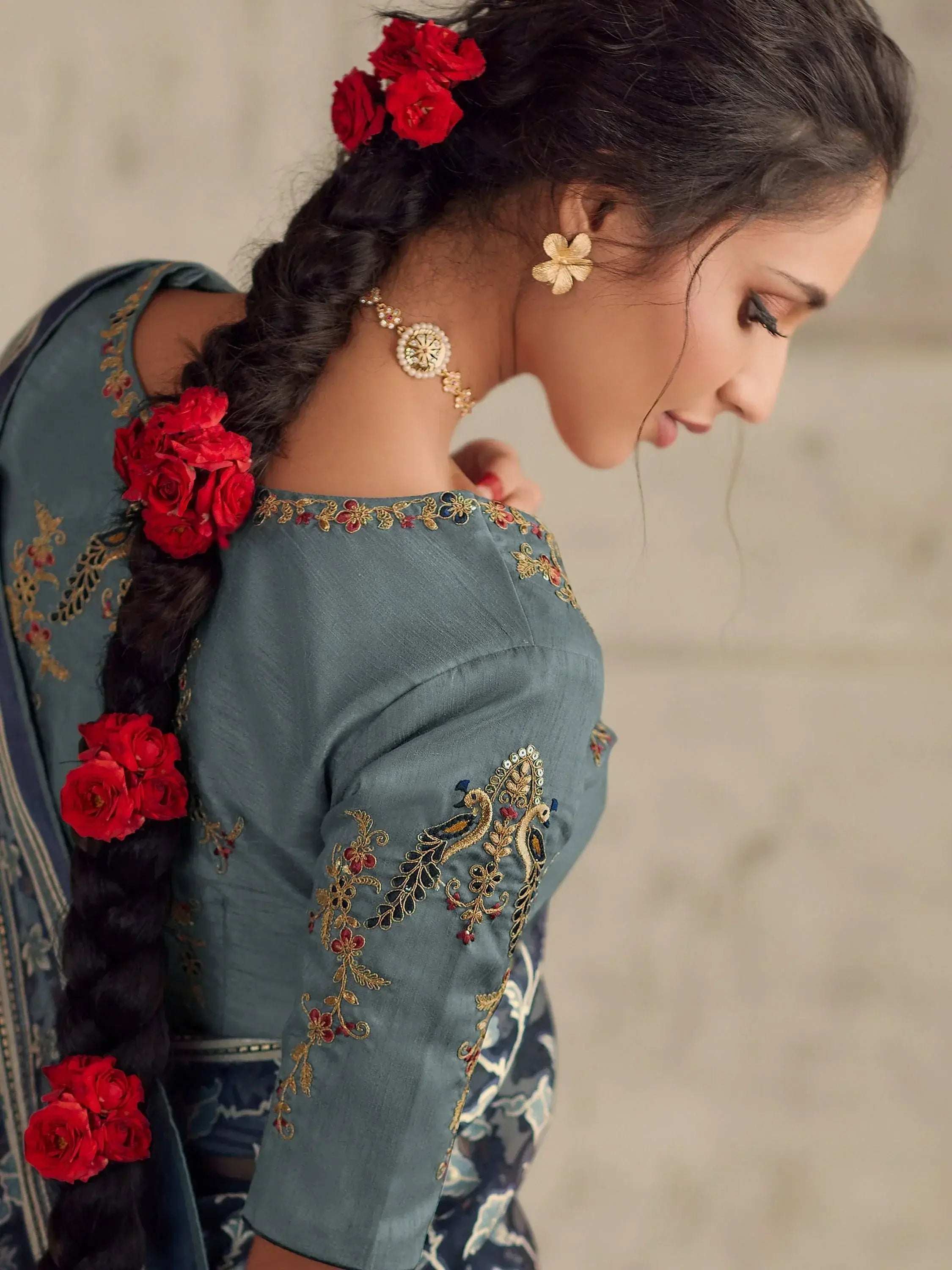 The black color saree features intricate brasso work, giving it a stunning and elegant look. Paired with a grey color silk blouse with sequin and embroidered work, this saree set is sure to make you stand out at any event.