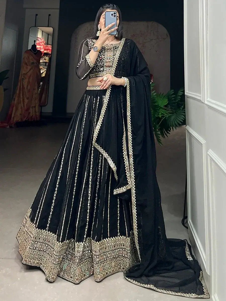 Introducing our captivating and mesmerizing "magnetic black embroidered georgette reception wear lehenga choli." This exquisite ensemble is the epitome of elegance and grace, designed to make you shine like a star on any special occasion.