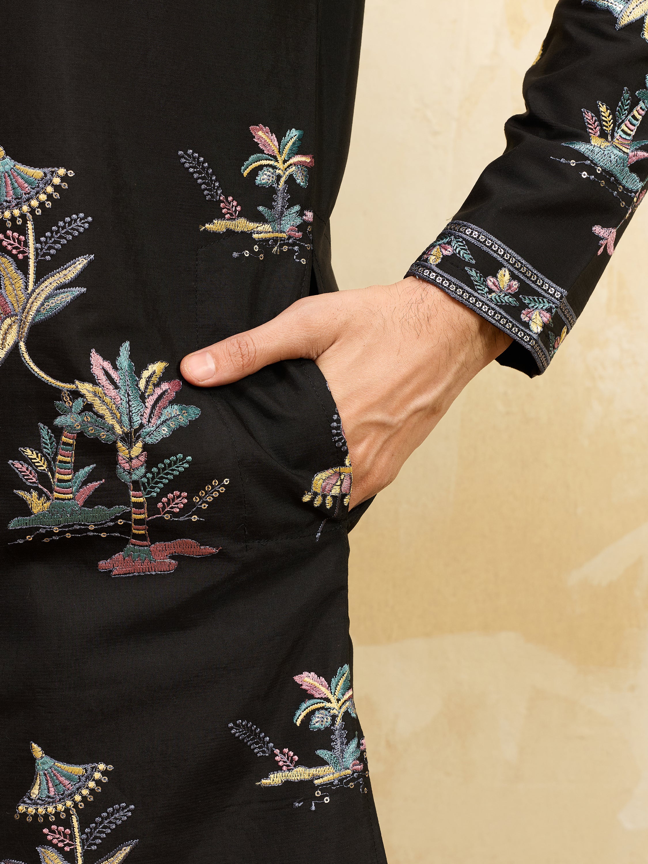 This black color men’s kurta is crafted from premium viscose silk fabric, offering a smooth texture and rich festive look.