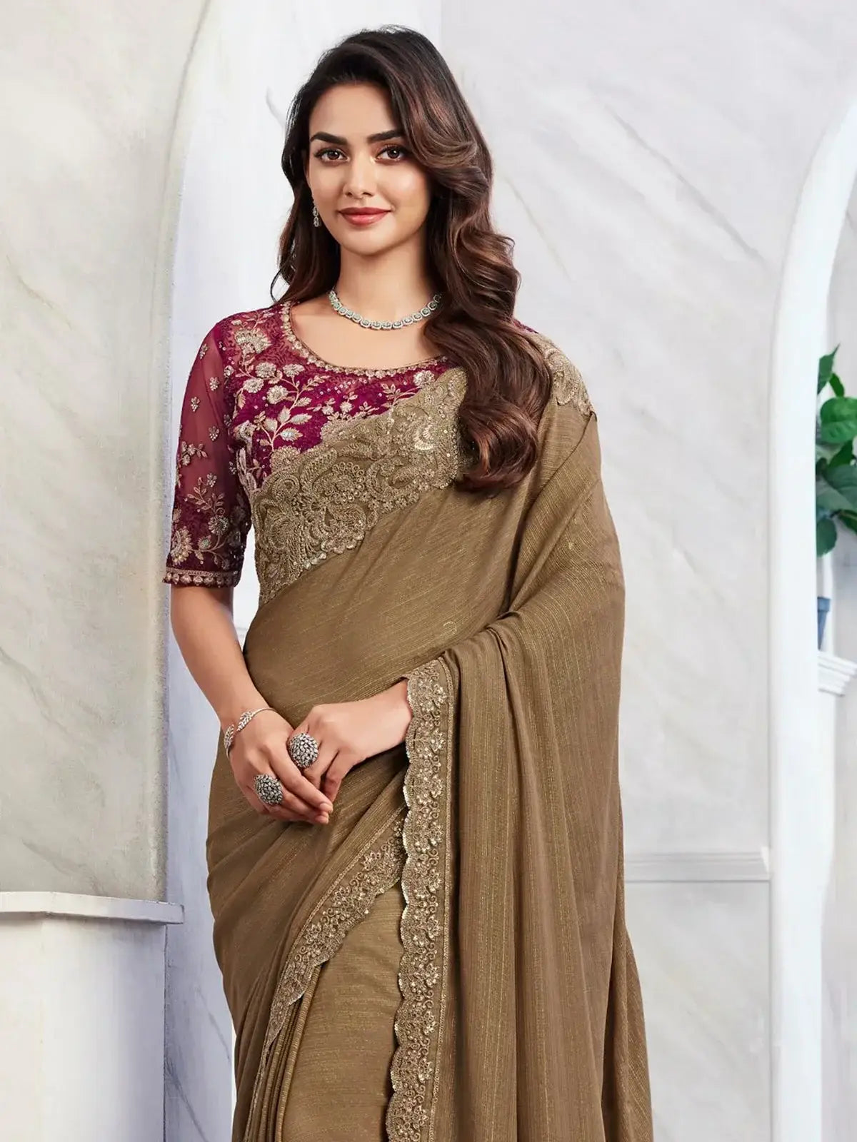 Celebrate your upcoming parties, events, and any occasion with the magnetic brown embroidered silk reception wear saree with blouse. This beautifully designed brown saree will give you the perfect ethnic look, making you stand out in the crowd. The saree features intricate sequin and embroidered work, adding a touch of elegance and sophistication to your ensemble.