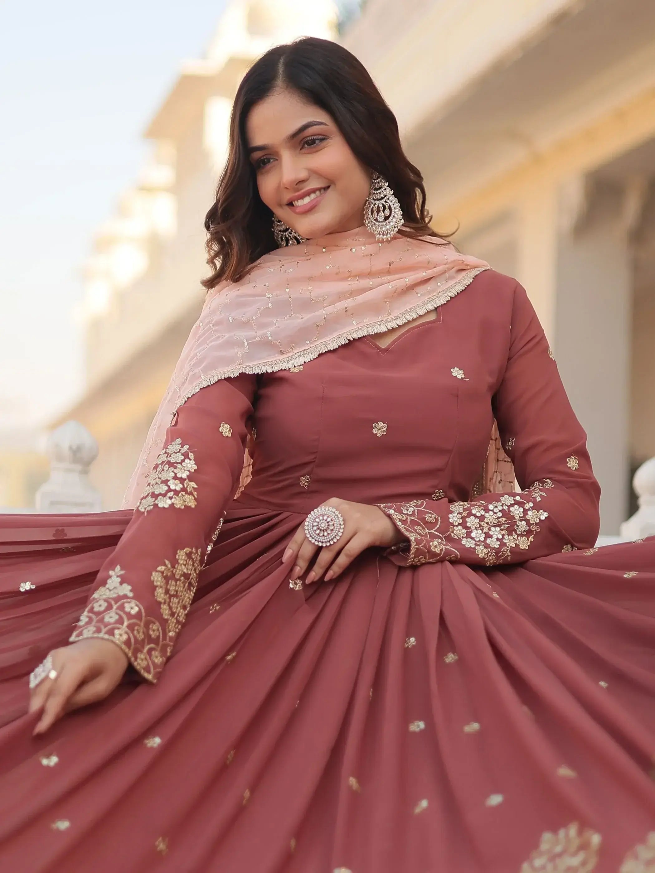 This coral red festival wear gown has its versatility. You can wear it to a variety of occasions such as festivals, events, receptions, or any special function, and be sure to make a lasting impression. The gown is fully stitched and available in sizes ranging from XS to XXL, ensuring a perfect fit for every body type. With a 3.5-meter flair and a gown length of 56 inches, this gown exudes grace and charm. The 2.3-meter-long dupatta adds an extra layer of elegance and completes the ensemble flawlessly.