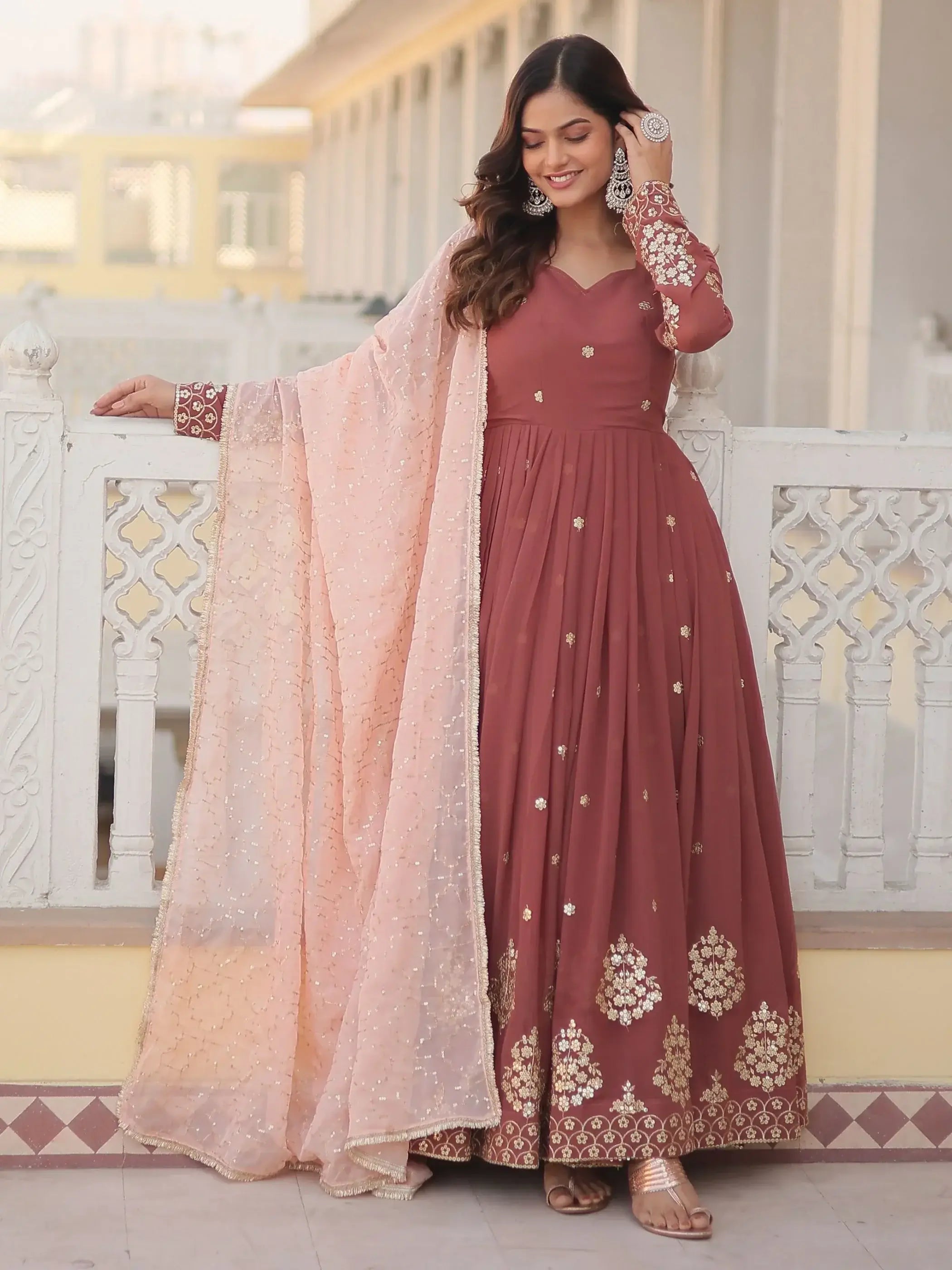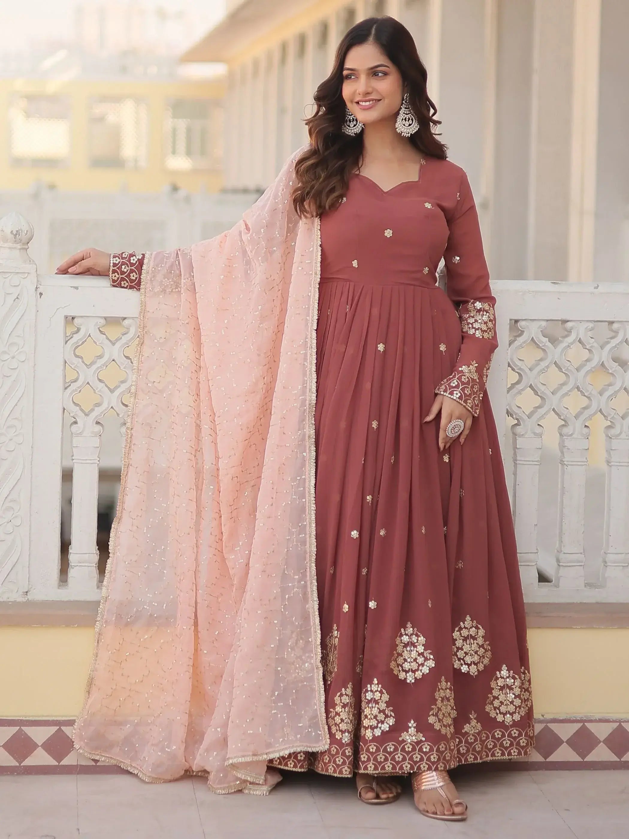This beautiful coral red gown is crafted from high-quality georgette fabric and features intricate zari sequin work and embroidered details that add a touch of elegance and sophistication. The matching silk dupatta complements the gown with its sequins embroidered work and designer lace border, creating a cohesive and stylish look.