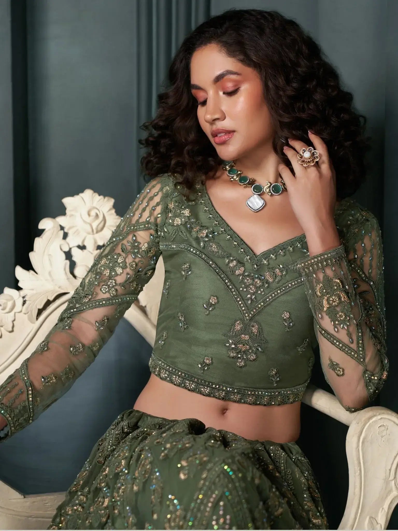 Step into elegance with our green bridal lehenga choli, crafted from delicate net material. This enchanting ensemble features intricate thread embroidery and badla work, blending traditional craftsmanship with contemporary style.