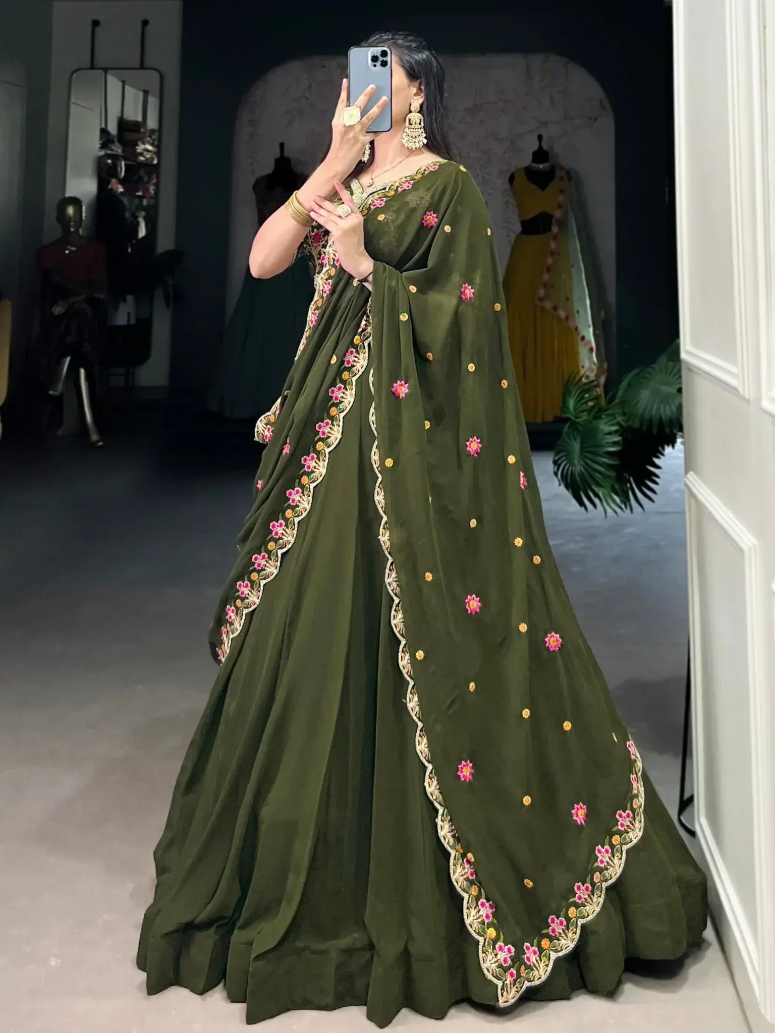 Perfect for mehendi functions and festive gatherings, this lehenga set is a graceful blend of comfort, tradition, and subtle glam. The fresh mehendi green shade paired with detailed craftsmanship makes it ideal for bridesmaids or even the bride herself during pre-wedding festivities. It's a timeless piece made to celebrate joyful moments with style.