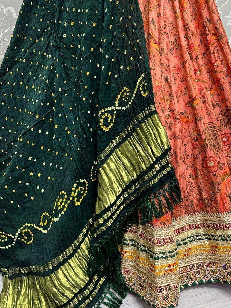 Accompanying the lehenga is a green-colored silk choli that complements the overall look. It showcases intricate thread embroidered work, adding a touch of sophistication to the outfit. Additionally, the set includes a green silk dupatta with bandhani print work, completing the traditional ensemble.