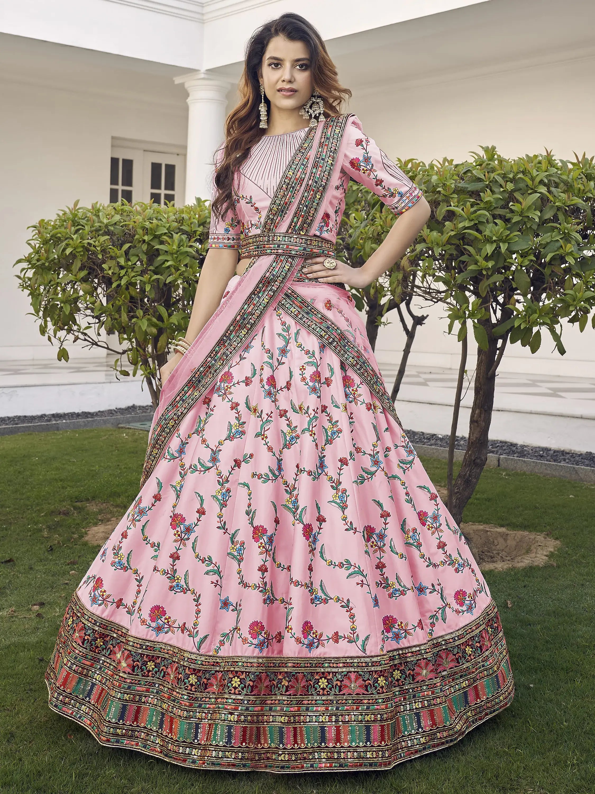 This lehenga comes pink color silk choli with a pink color thread embroidered border net dupatta featured with sequins and thread embroidery work all over.
