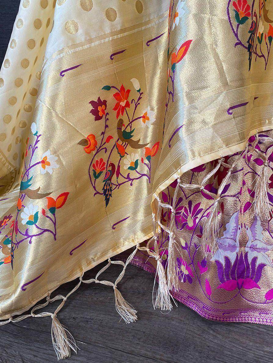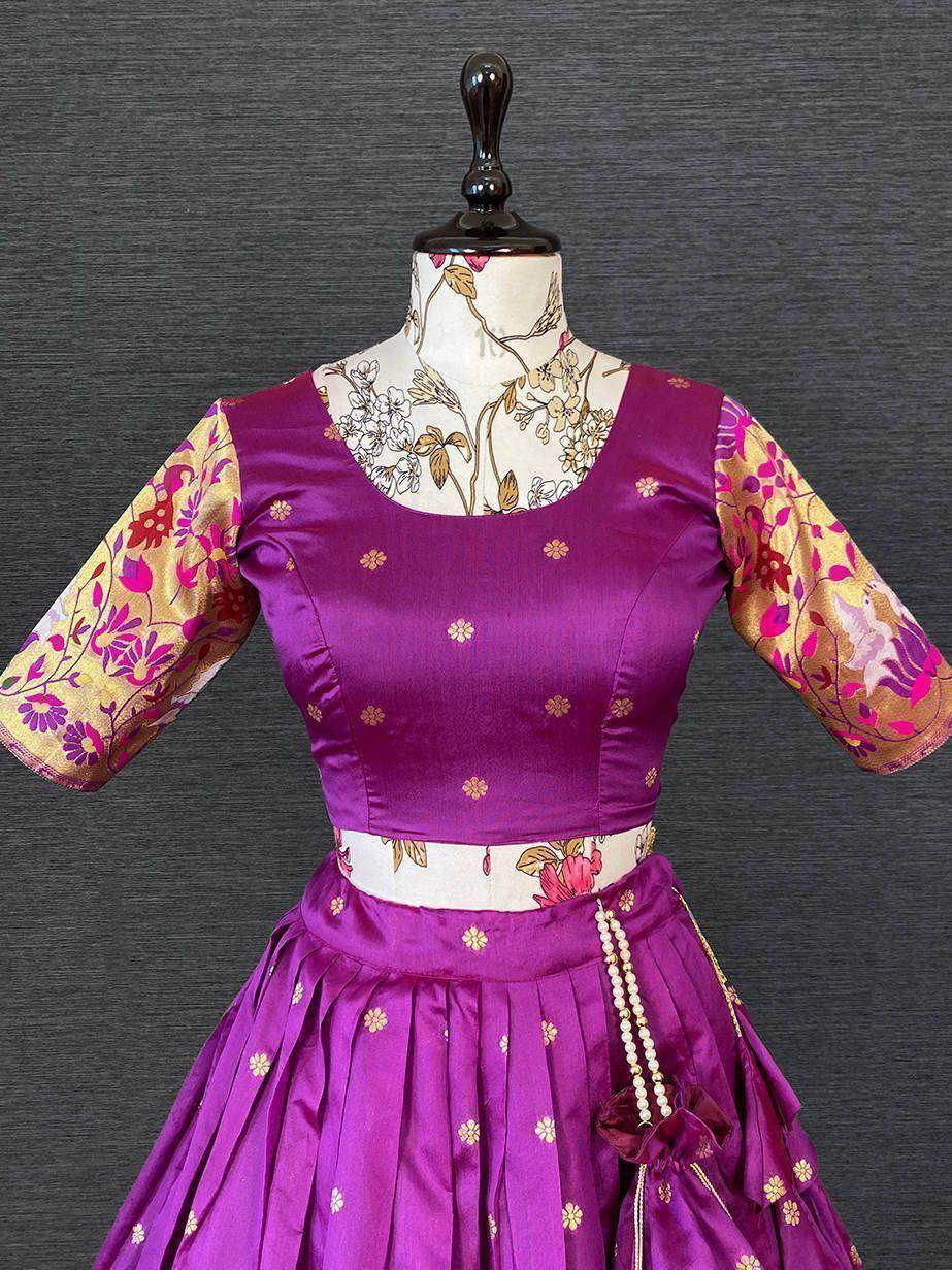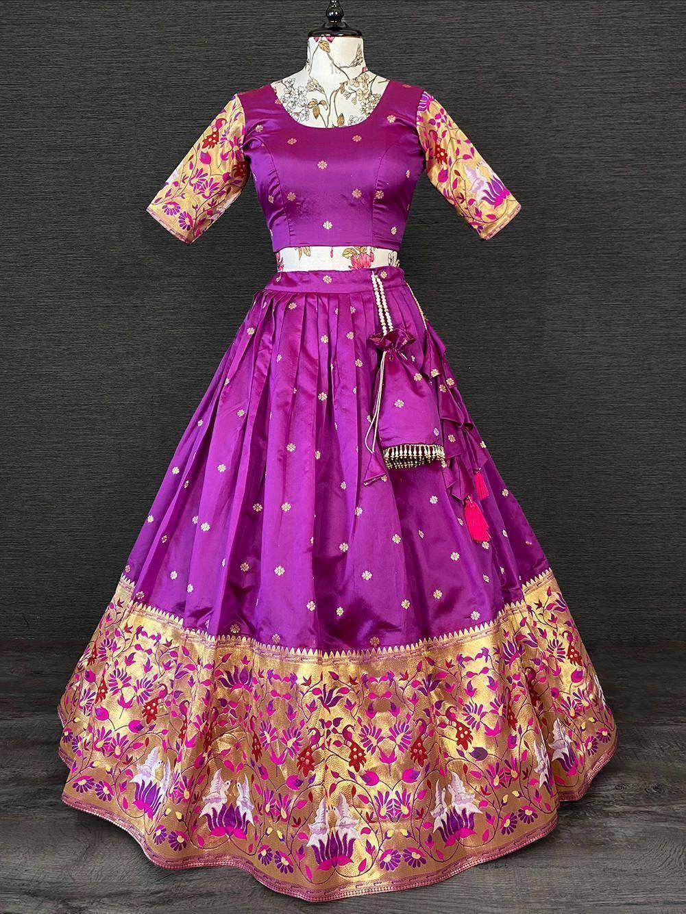 Step into a realm of royal grandeur with our stunning purple Half Saree Lehenga. Each piece is meticulously crafted, featuring exquisite weaving work on rich jacquard fabric, promising a look that is both traditional and sophisticated.