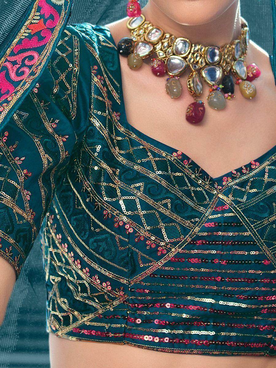 Make the heads flip whenever you dress up with this teal blue-colored wedding wear lehenga accomplished with heavy sequins and multi-color thread embroidery work all over the lehenga.