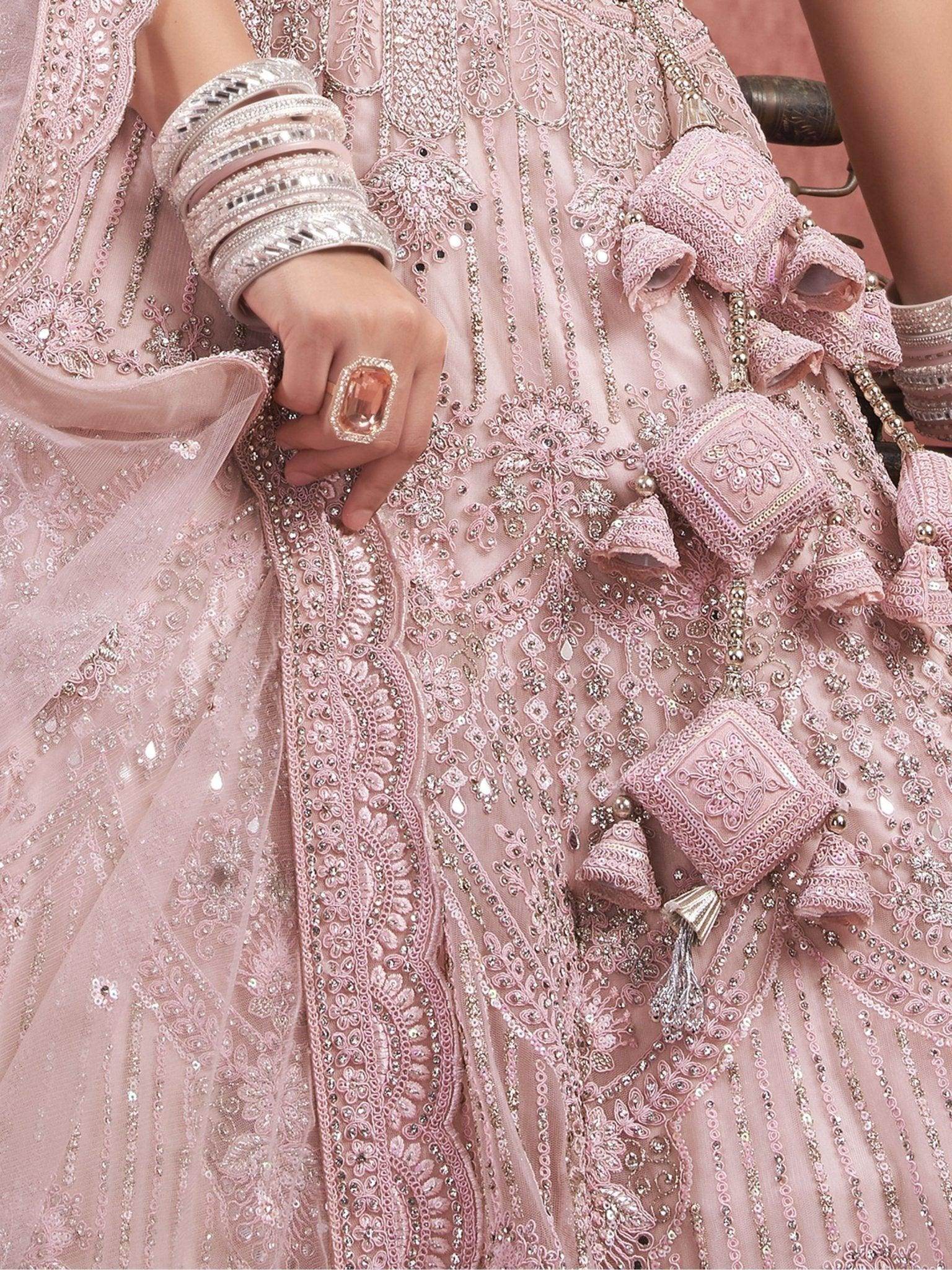 Get ready to dazzle on your special day with our majestic dusty pink bridal lehenga choli. Crafted from elegant net material, this stunning ensemble is adorned with intricate mirror and jarkan work, ensuring you radiate grace and sophistication.