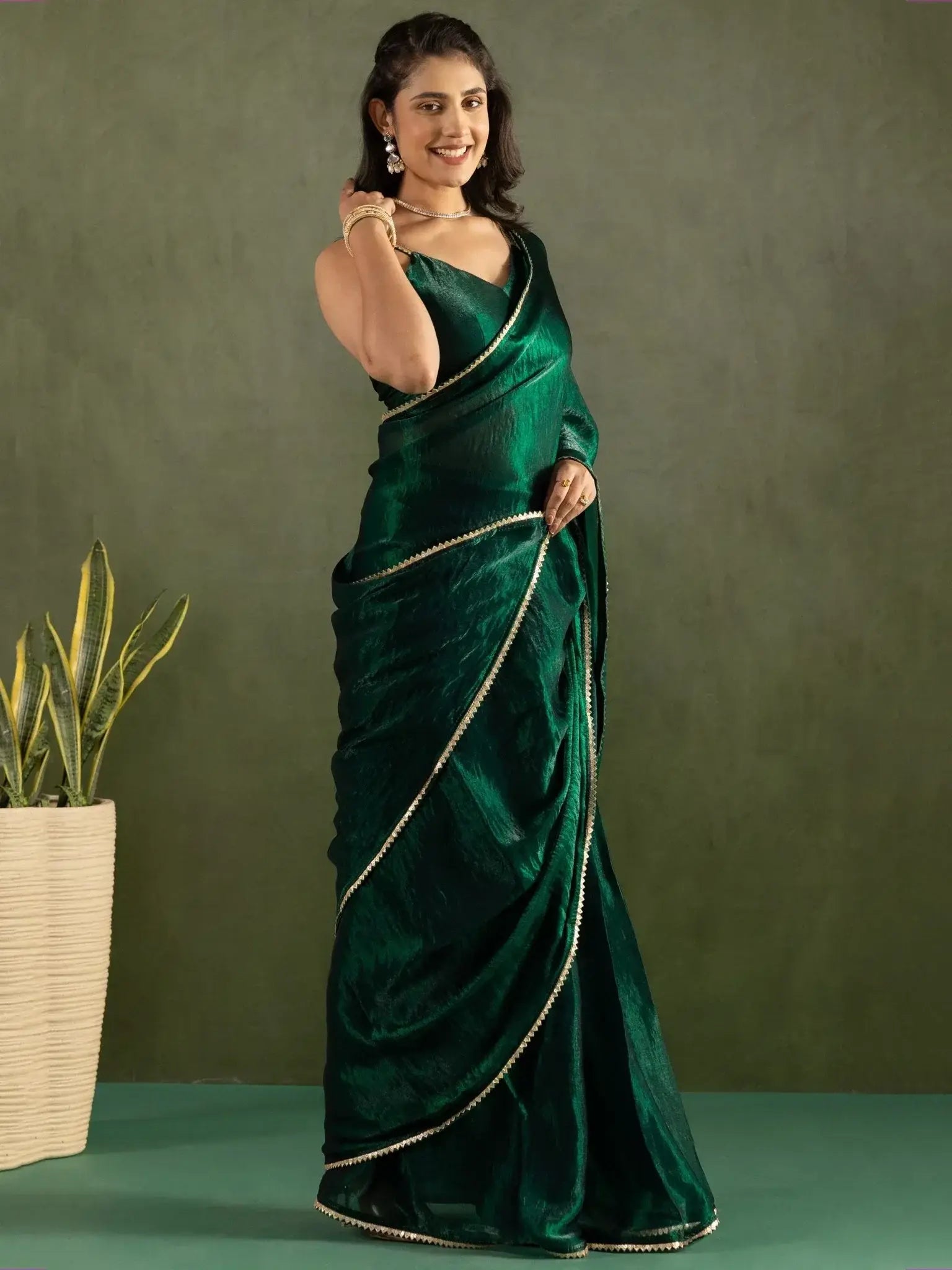 Make a timeless impression in this stunning green chiffon saree featuring a shimmering texture. Accentuated with a delicate lace border, it's designed to elevate festive and formal looks.