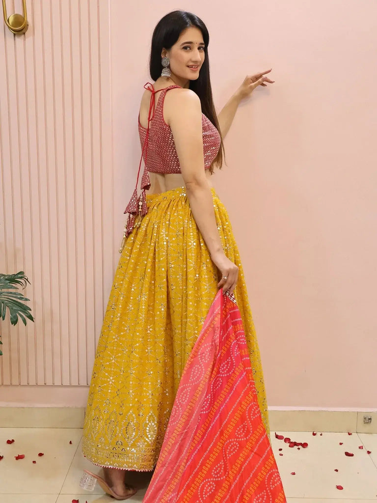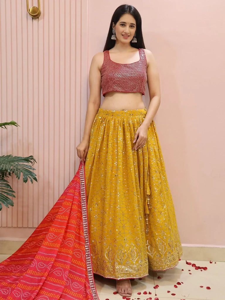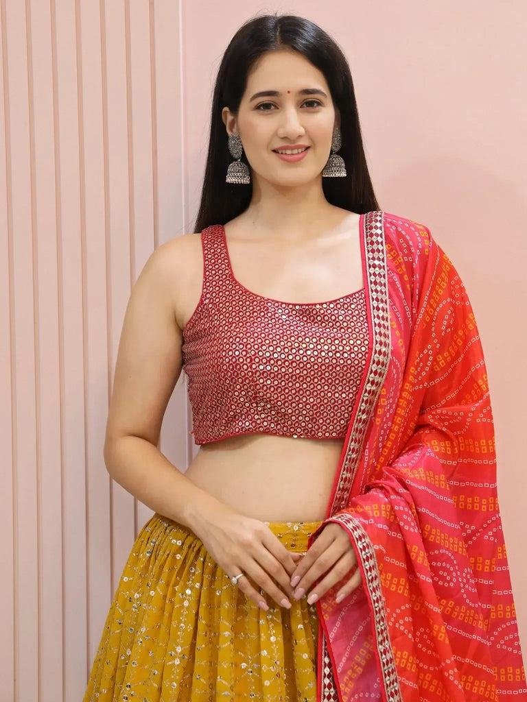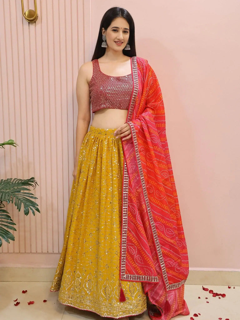 This vibrant lehenga choli set showcases a lively combination of mustard yellow and pink hues. Made from soft georgette fabric, the lehenga features intricate zari and sequins embroidery work.