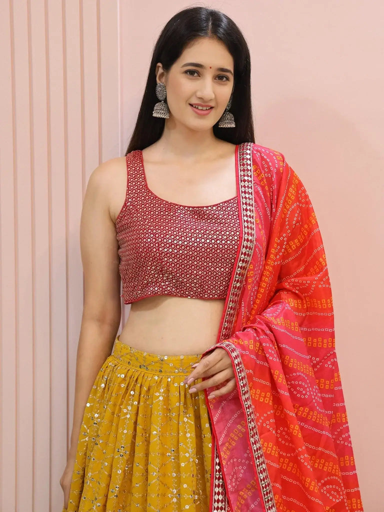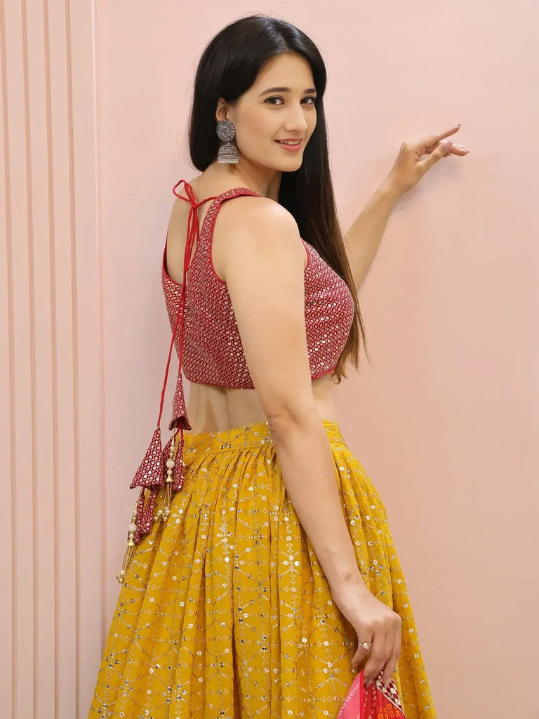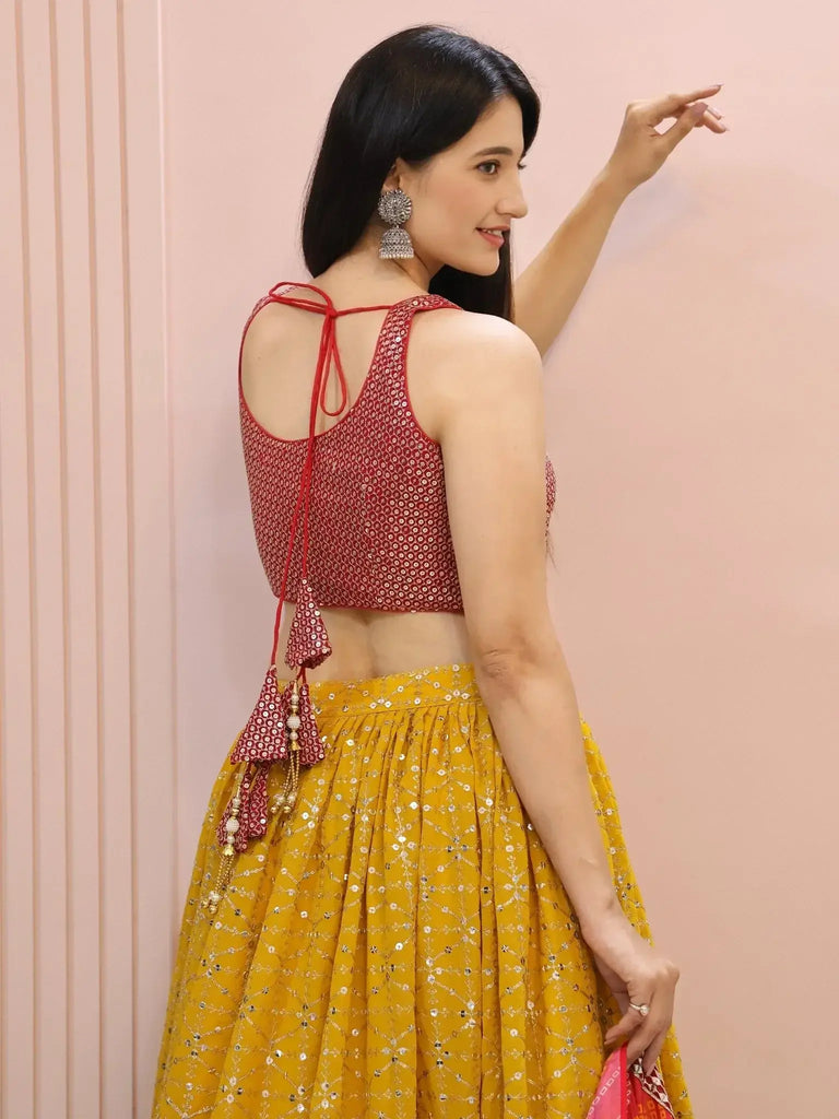 The choli is adorned with mirror-style sequins that add a festive shimmer to the ensemble. It is tailored in a flattering sleeveless cut with a tassel-tie back for added elegance.