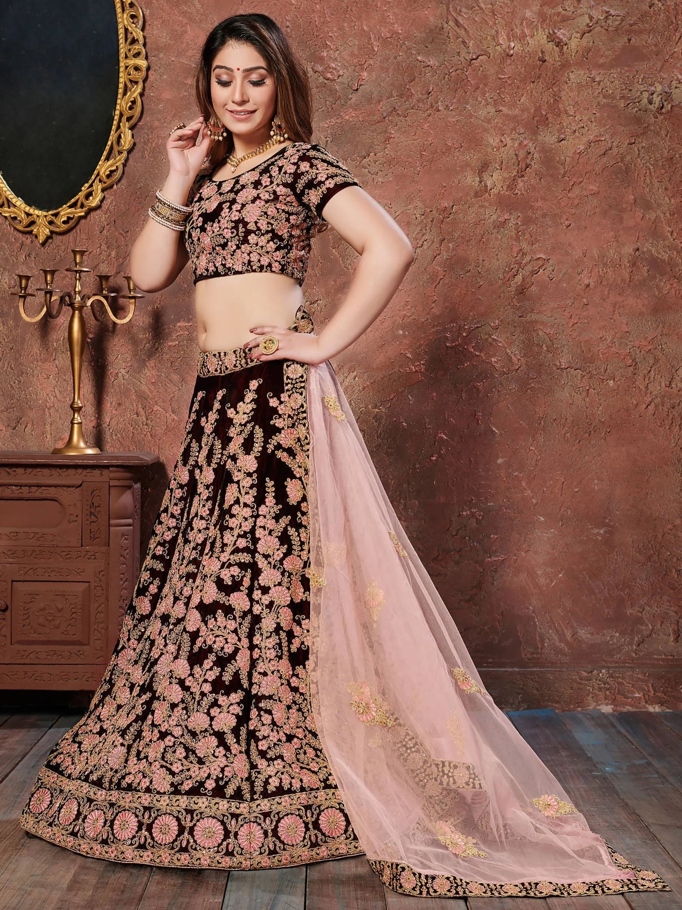 There are bridal lehengas, and then there’s this. A maroon bridal lehenga choli set so lavish, so breathtakingly royal, it doesn’t just turn heads—it halts time. The rich velvet silk fabric gossips opulence, while detailed thread needlework weaves a tale of romance in every stitch. And that pastel pink dupatta? A soft, dreamy contrast that seals the deal on bridal perfection.