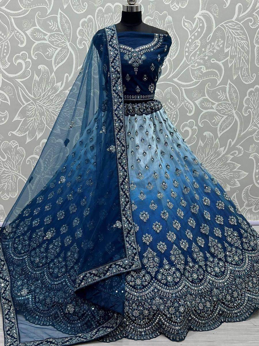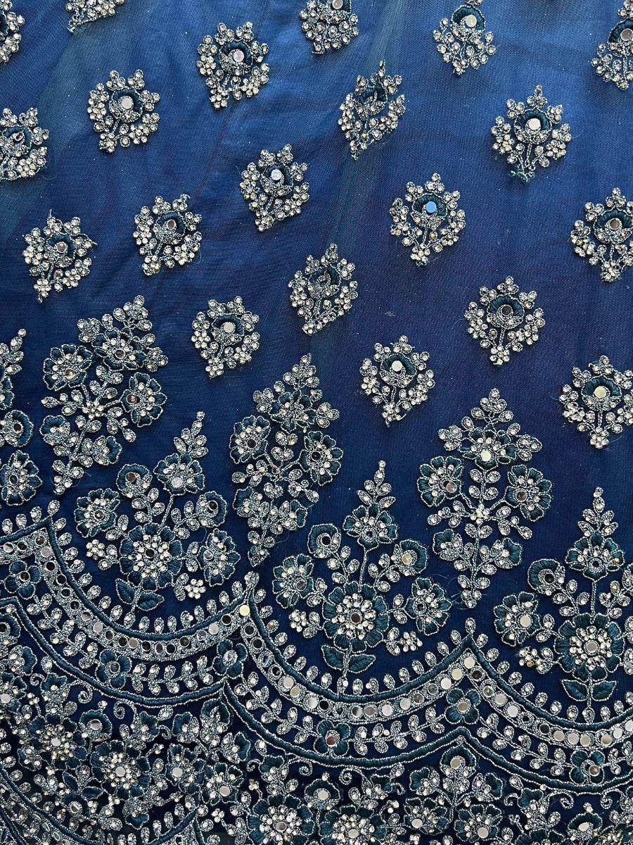 Get a elegance glam to your personality with this gorgeous blue color shaded lehenga formed with bridal net material designed with sequins embroidery, mirror work and zircon diamonds.