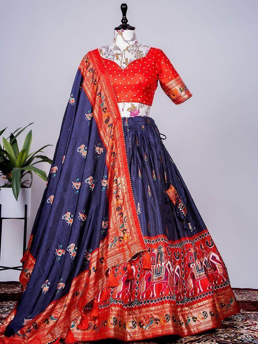 This traditional touch marvelous look cocktail of patola and paithani lehenga paired up with contrasting red color choli with a paithani look, also has a navy-blue dola silk dupatta with paithani and patola print.