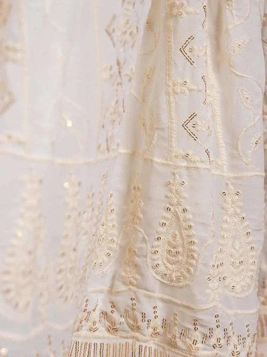 Create a magnificent effect with your fashion sense by wearing white color lehenga formed with georgette material and embellished with white thread embroidery and golden sequins.