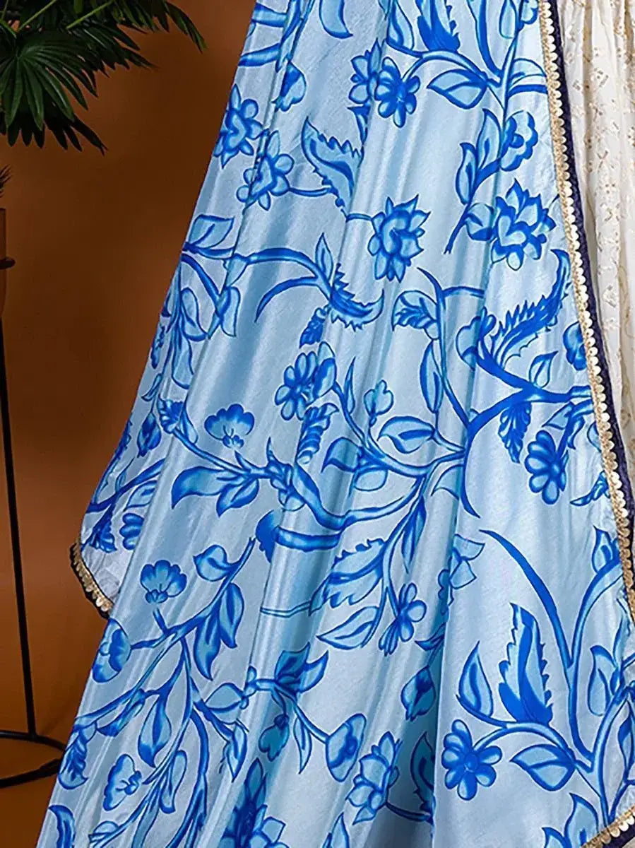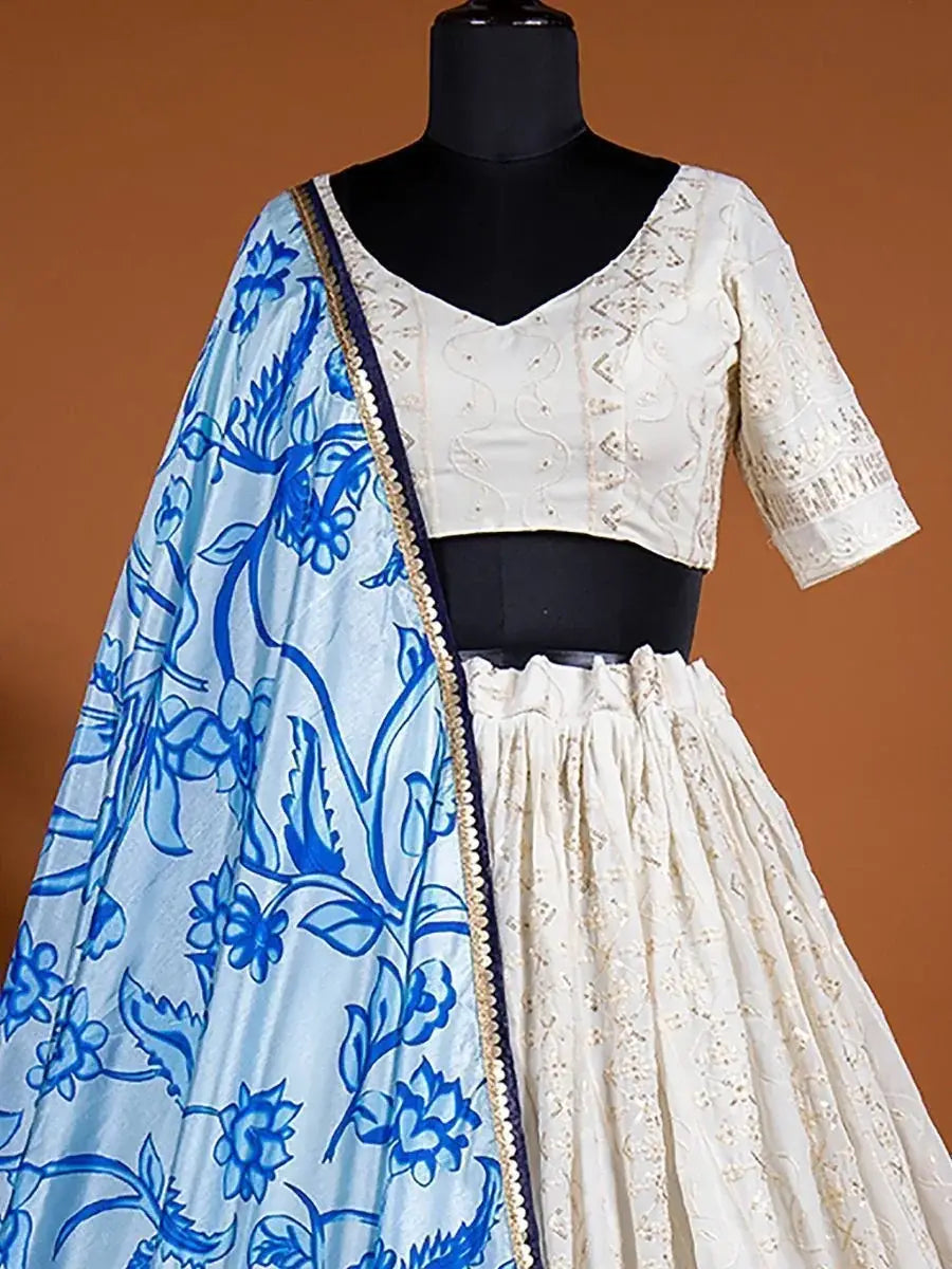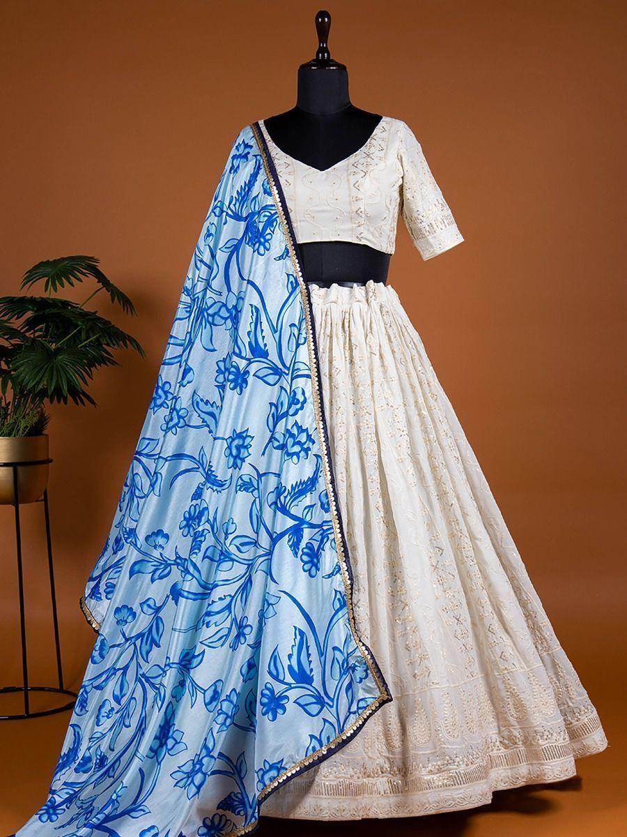 This white lehenga arrives with a white color choli having same color thread embroidery and sequines work paired with cobalt blue color floral printed dola silk dupatta with golden lace on border.