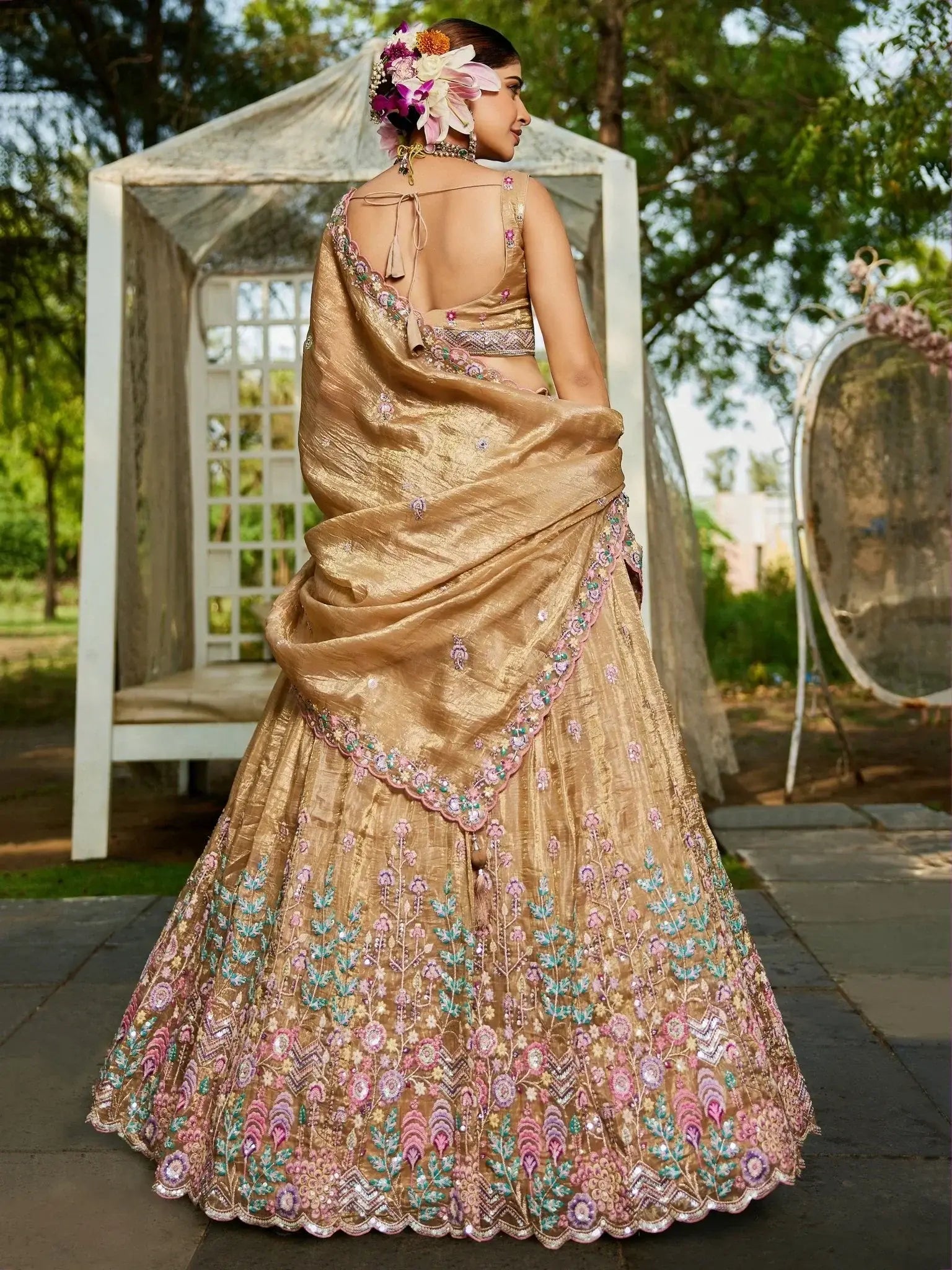 This golden tissue lehenga choli is designed with intricate sequins and multi-thread embroidery that exudes traditional elegance. The blouse features detailed floral patterns and a flattering neckline, creating a luxurious and refined look.