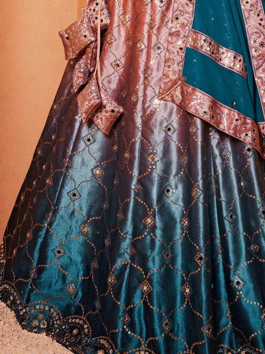 Make your bridal look captivating by wearing this blue-pink color sequin lehenga choli. This blue-pink color lehenga is made of velvet material embellished with sequins embroidery with all-over mirror work.