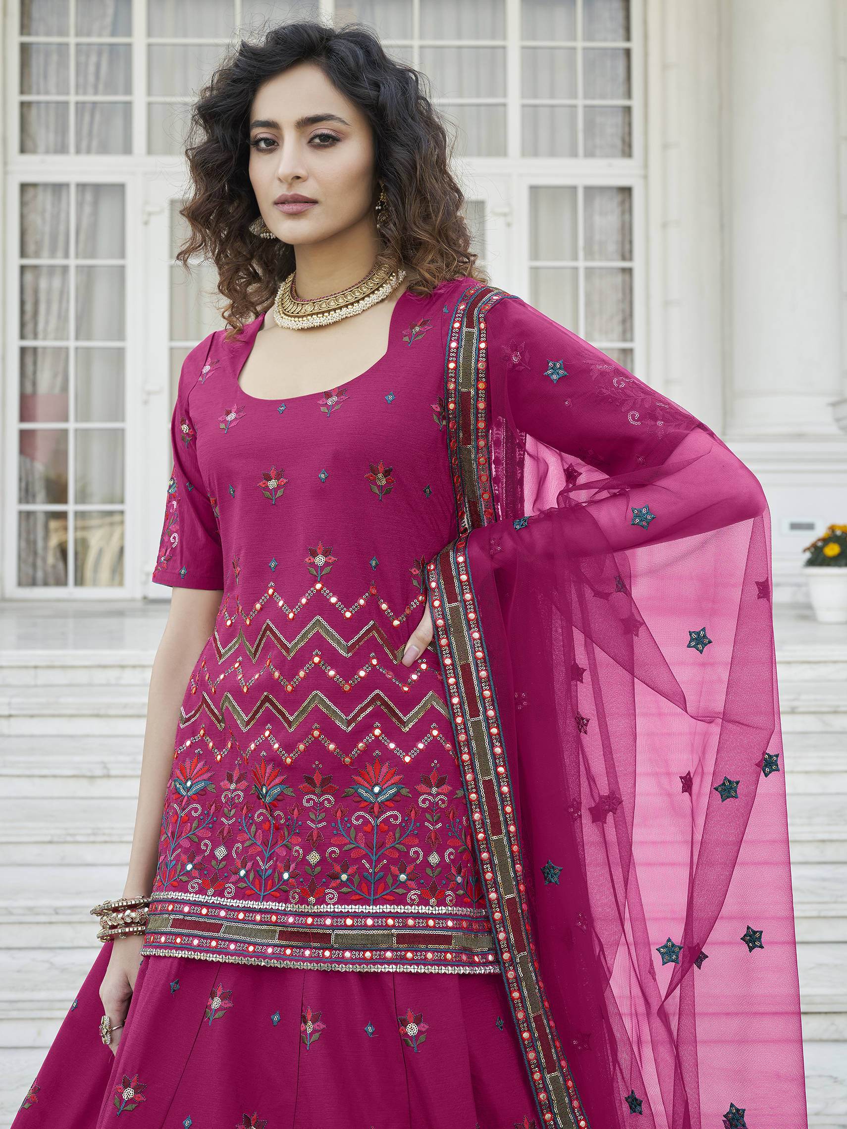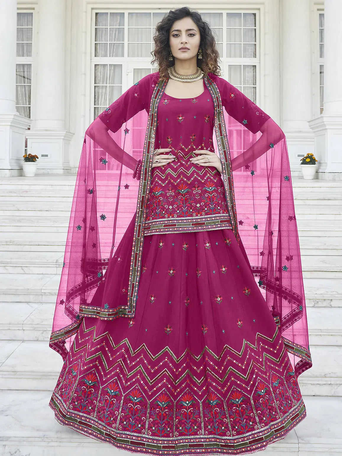 Delightful in look and stately in appeal, this brilliant piece is designed in this marvelous deep pink color chinon chiffon material lehenga choli embellished with gotta patti and multi-thread with sequins embroidery with floral work.