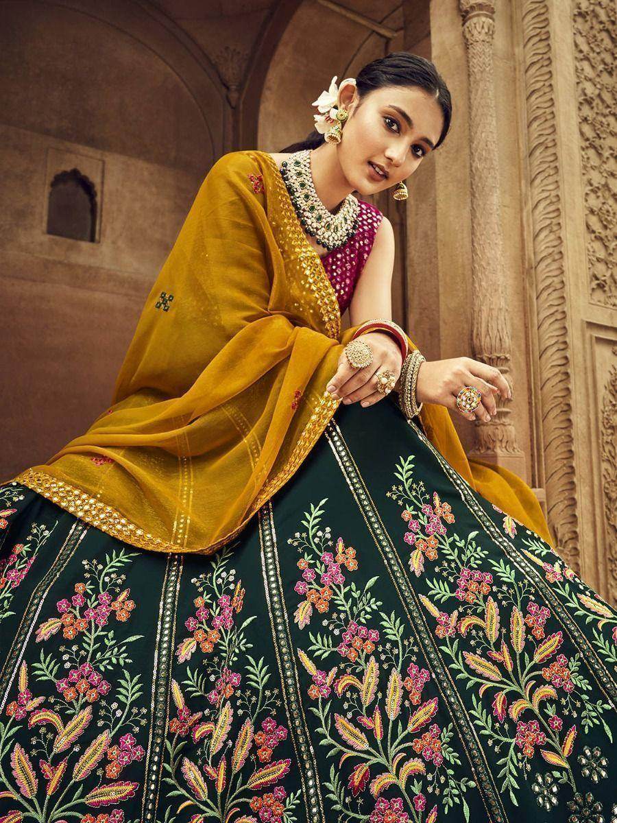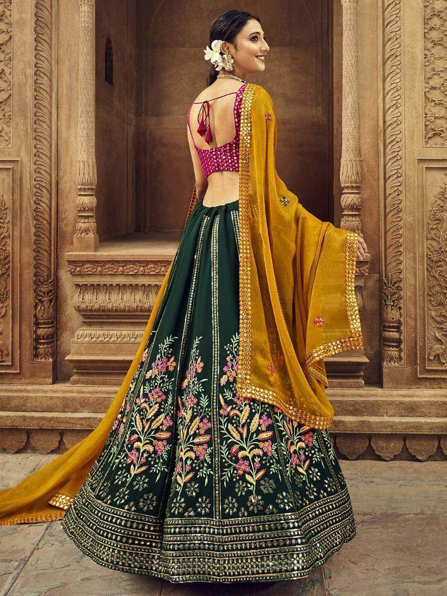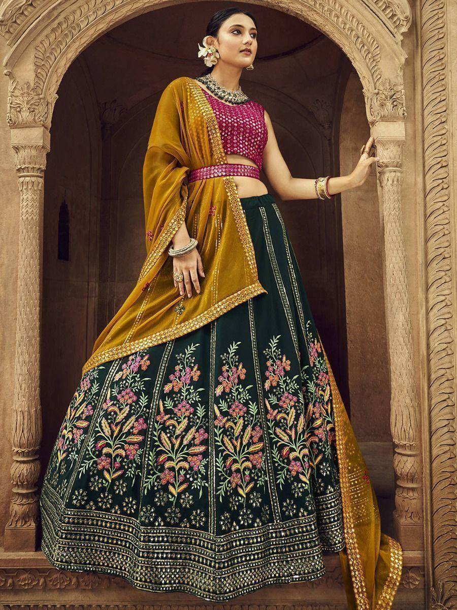 Bring out the best fashion sense with this green-colored wedding lehenga made of georgette material beautifully crafted with foil work, thread, and sequins embroidered work. Lehenga paired with an embroidered belt.