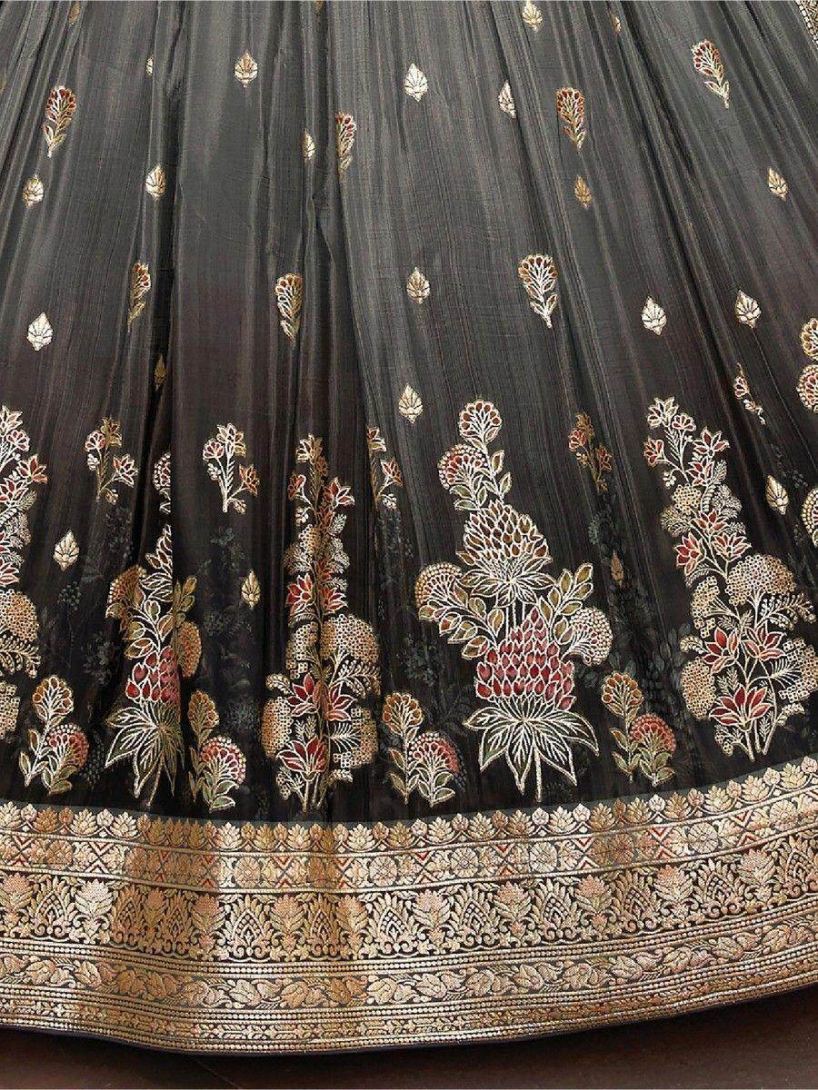 To complete the ensemble, a black-colored silk dupatta with floral print work and a beautiful zari-weaving lace borderwork is included. The dupatta adds a touch of sophistication and completes the overall look with finesse.