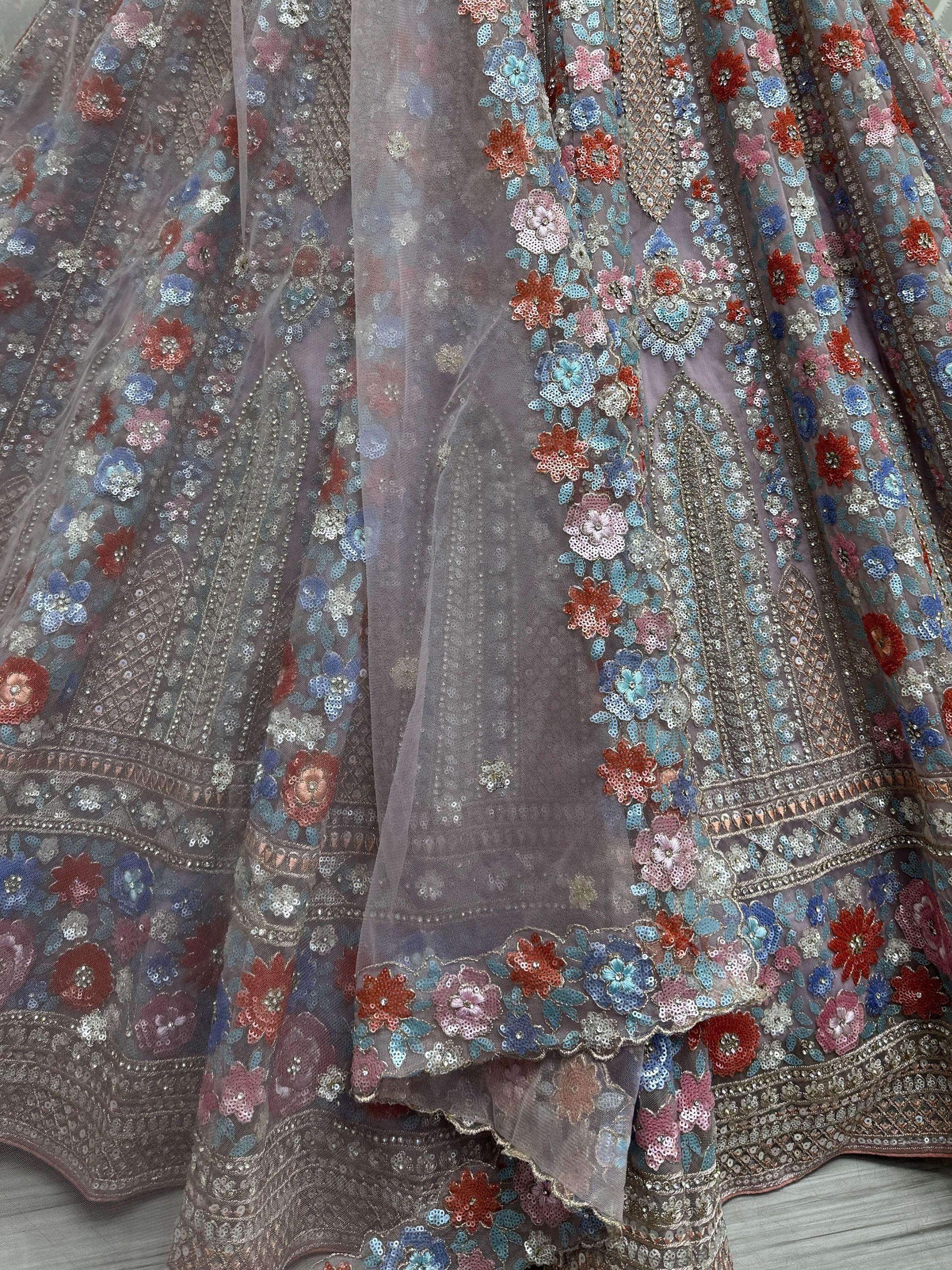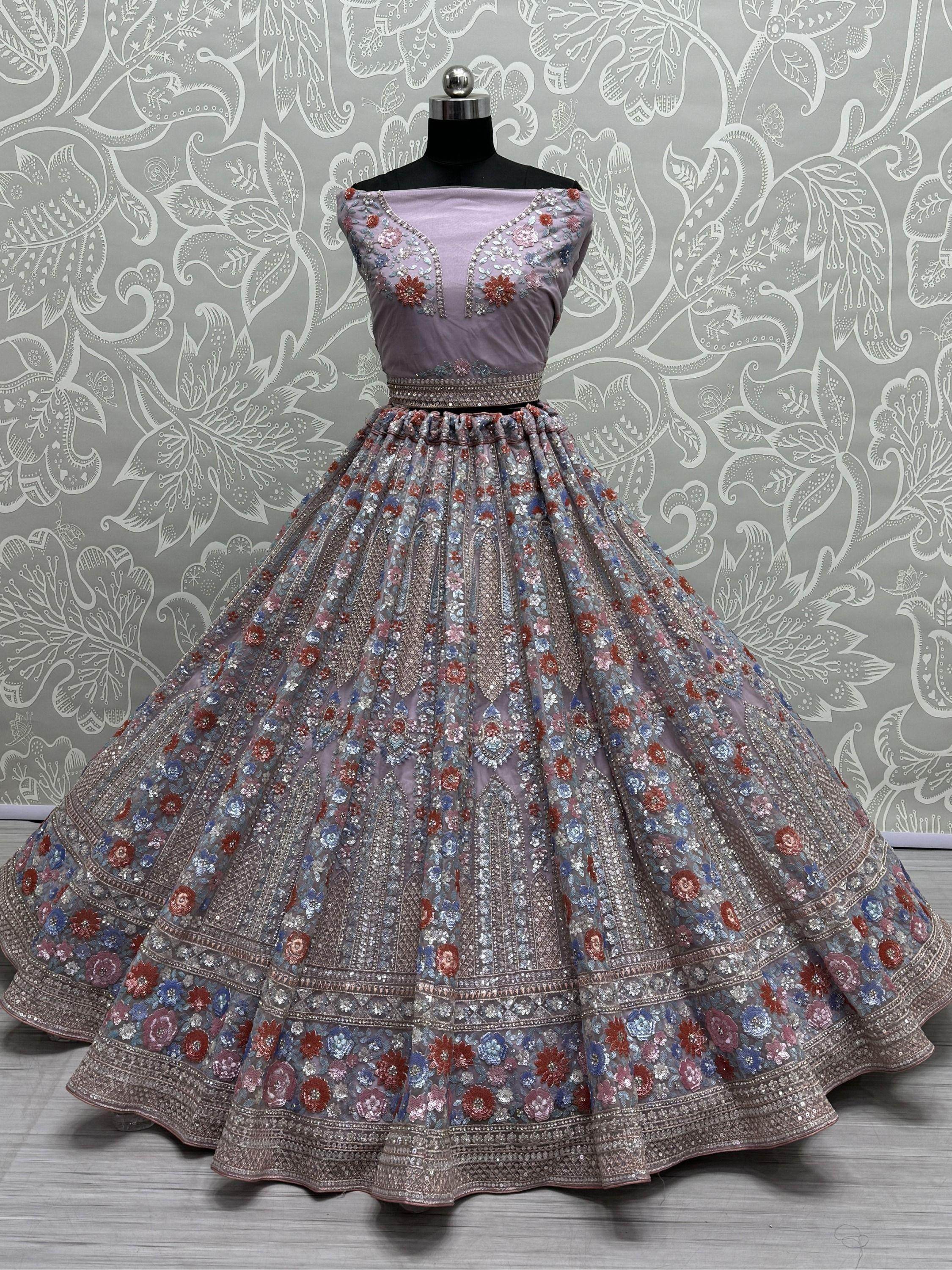 This stunning lavender lehenga choli ensemble is designed to envelop you in an aura of timeless elegance and sophistication. Crafted from delicate net material, the lehenga features an exquisite array of embellishments including intricate threadwork, shimmering sequins, ornate zari embroidery, sparkling zircon detailing, and glistening diamond accents, creating a mesmerizing tapestry of luxury and grace.