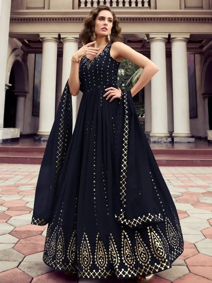 This navy blue gown comes with a similar color dupatta made with georgette created with thread and sequins embroidered work.