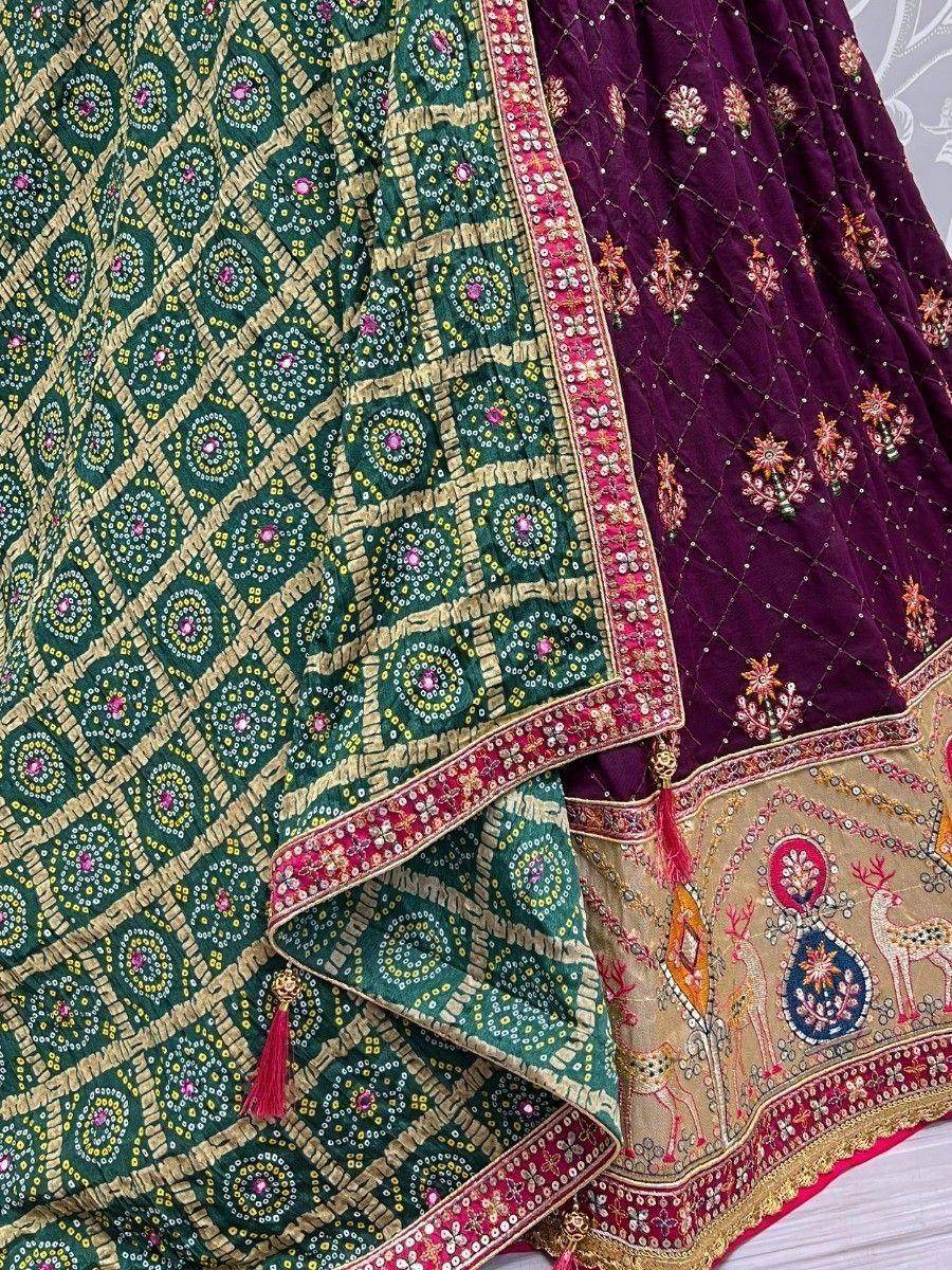To complete the look, a green chiffon dupatta with bandhani print work and fancy lace border work is included. The contrasting green color adds a pop of vibrancy and complements the purple lehenga and choli beautifully. The dupatta drapes gracefully, adding a touch of elegance and grace to the overall attire.