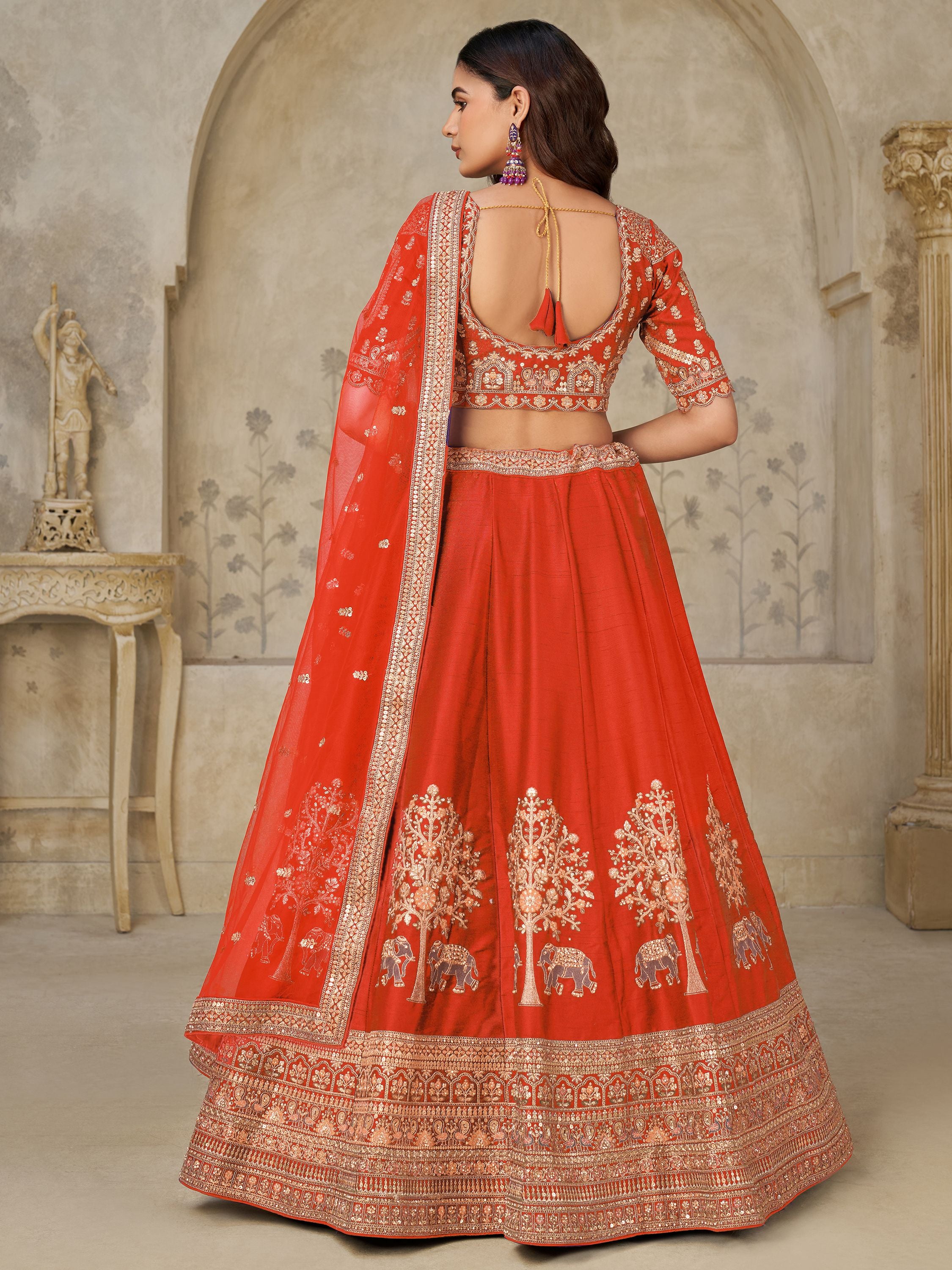 This stunning rust-orange lehenga radiates a perfect blend of heritage and festivity. The luxurious silk fabric is intricately detailed with golden zari embroidery, featuring royal elephant and tree motifs that symbolize prosperity and tradition.