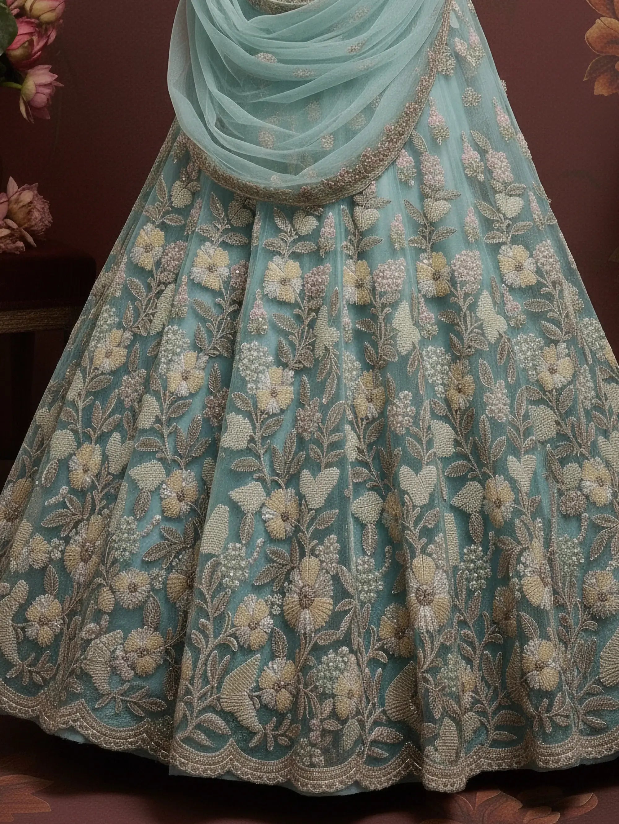 This enchanting semi-stitched heavy net lehenga in a serene aqua hue features detailed crystal pipe handwork and multi-color motifs. Adorned with sober sequins, zari, and dori embroidery, it exudes sophistication and timeless grace for festive occasions.