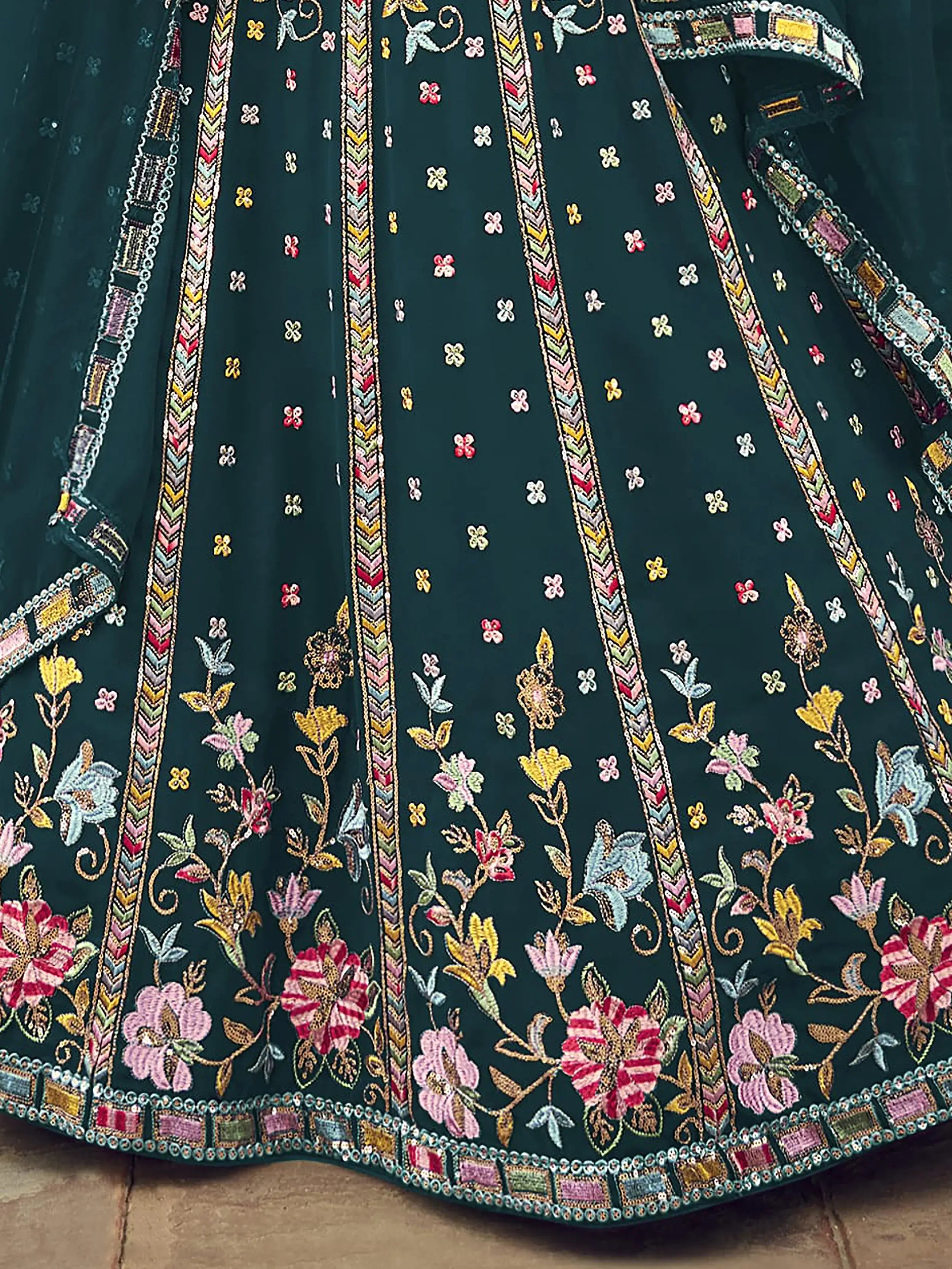 The Teal blue lehenga is semi-stitched and can be customized up to 42 inches. Choli is unstitched fabric in 1 meter and along with 2.40 meters dupatta.