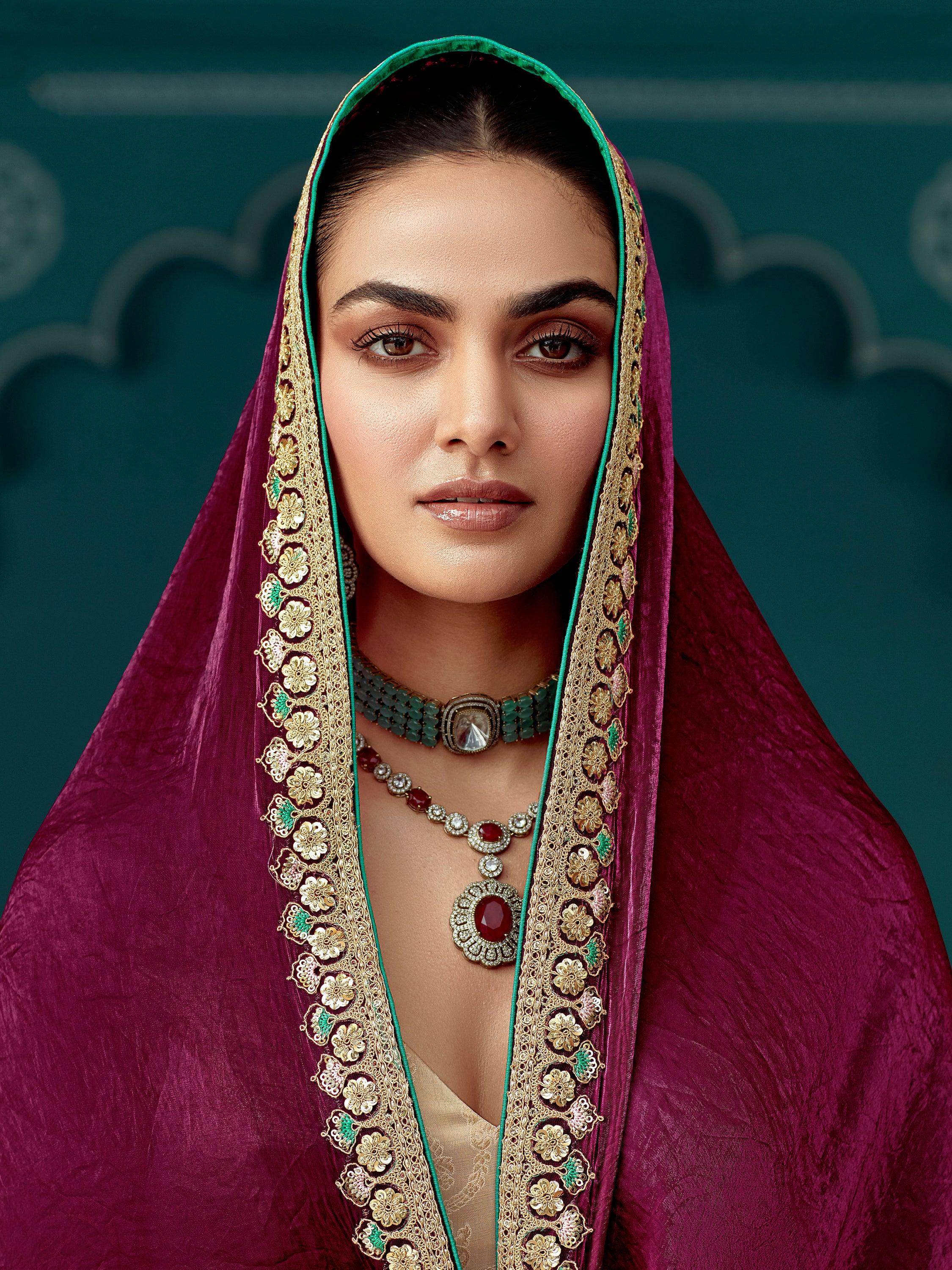 The stunning saree features a wine color tissue silk fabric with intricate thread embroidery and sequin border work, giving it a luxurious and ethnic look. The beige silk blouse complements the saree perfectly with zari weaving work and embroidered sequin details.