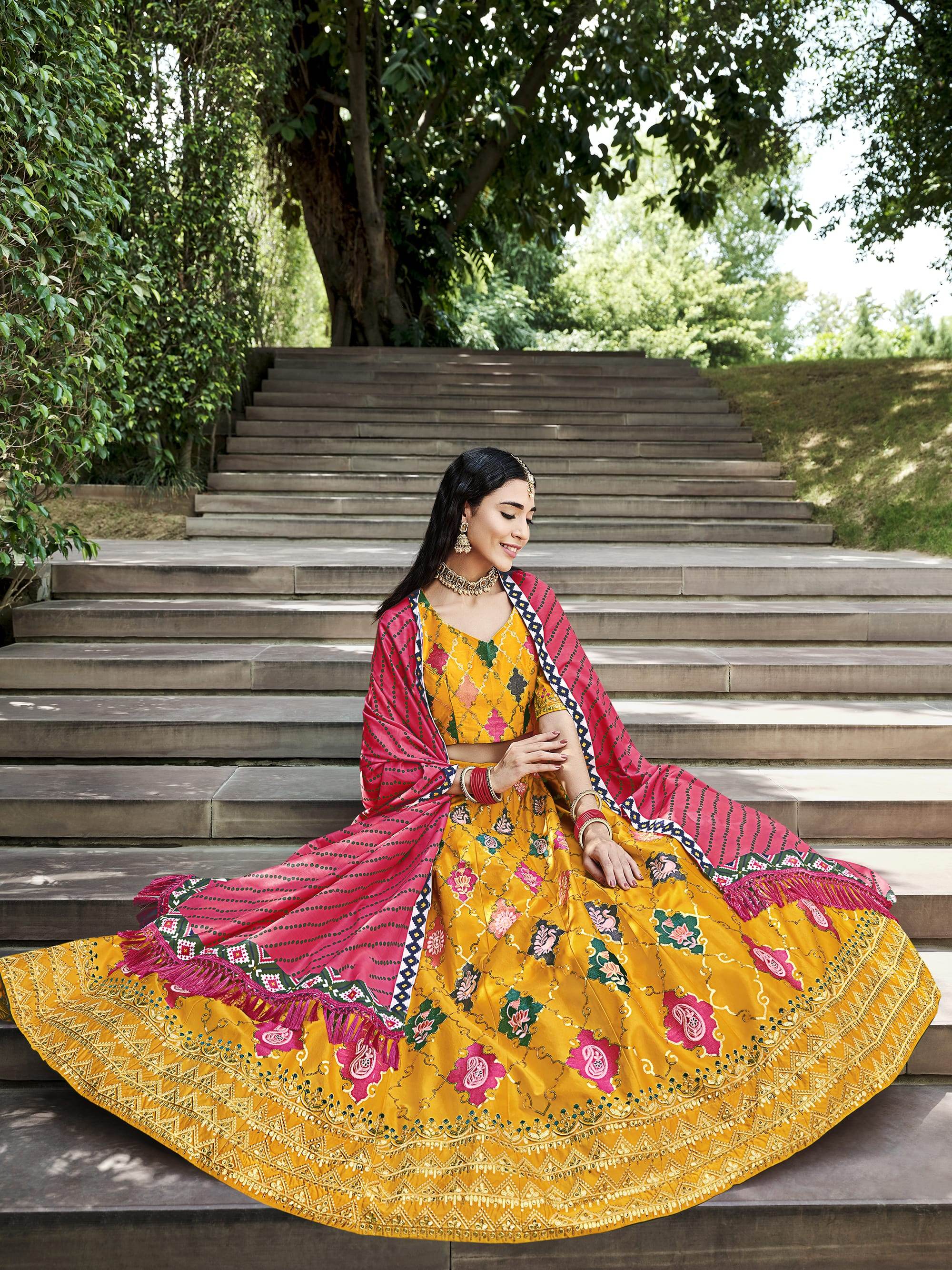 This yellow lehenga arrives with a similar color silk material choli created with thread embroidery and sequins work. It also comes with a pink-color maslin cotton material dupatta designed with digital print and thread lace border.