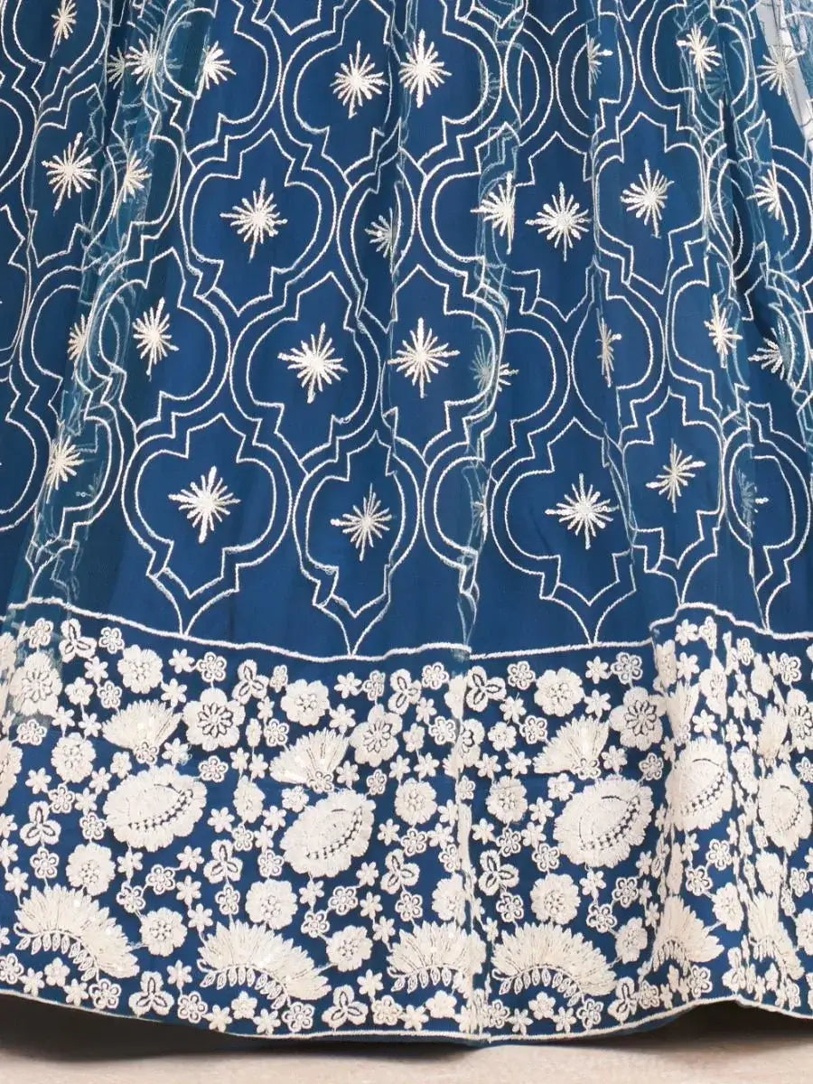 Add a vibrant burst of color to your wardrobe with this blue color lehenga crafted with net fabric completed with sequins work and thread embroidery. It also has American crepe inner material.