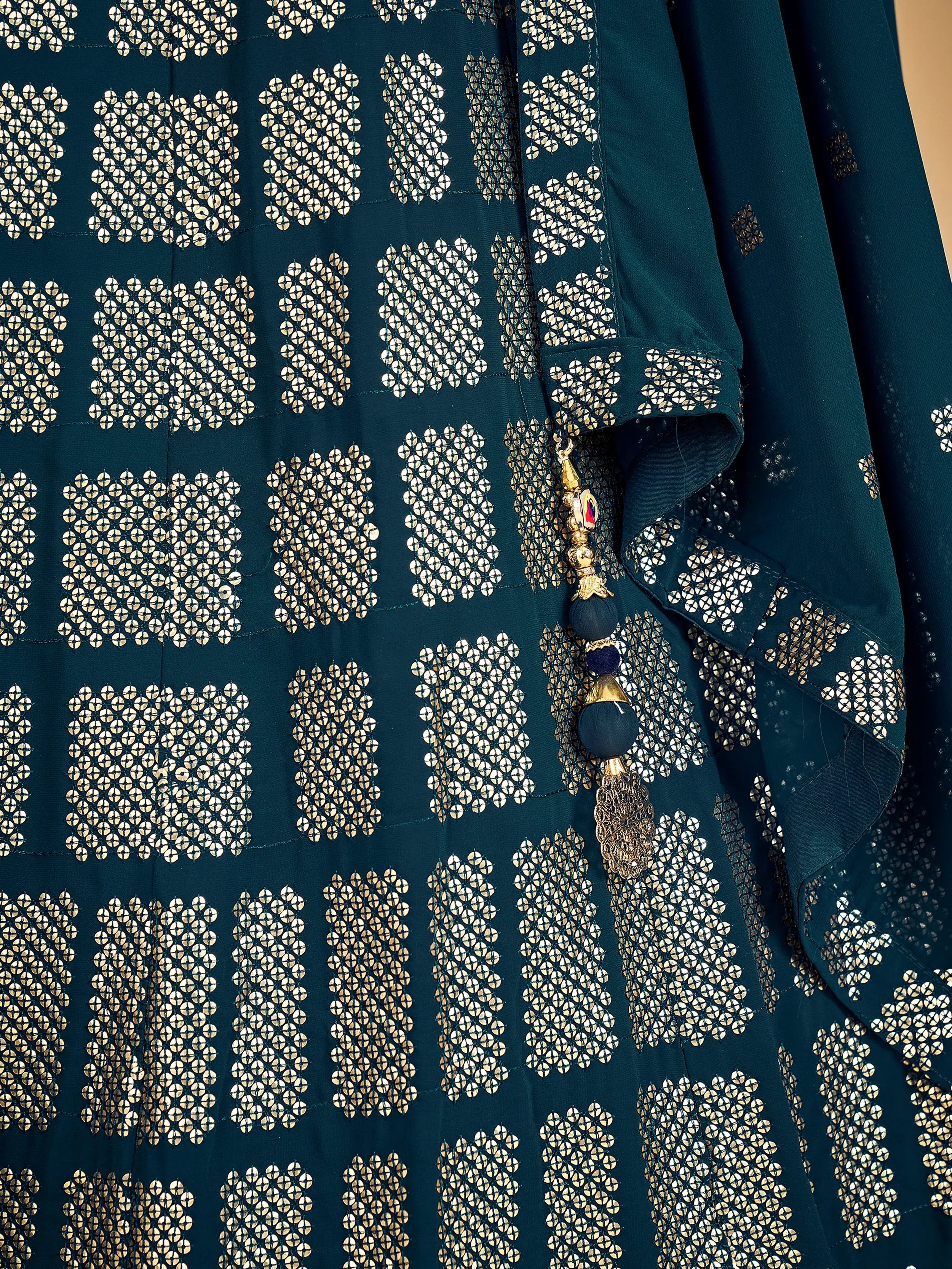 The choli, in a similar teal blue color, is embellished with georgette material and showcases the same sequin and thread embroidery work as the lehenga. This harmonious coordination between the lehenga and choli creates a cohesive and visually stunning outfit. Moreover, the georgette dupatta, also in a similar color, complements the lehenga choli set with its sequin and thread embroidery work.