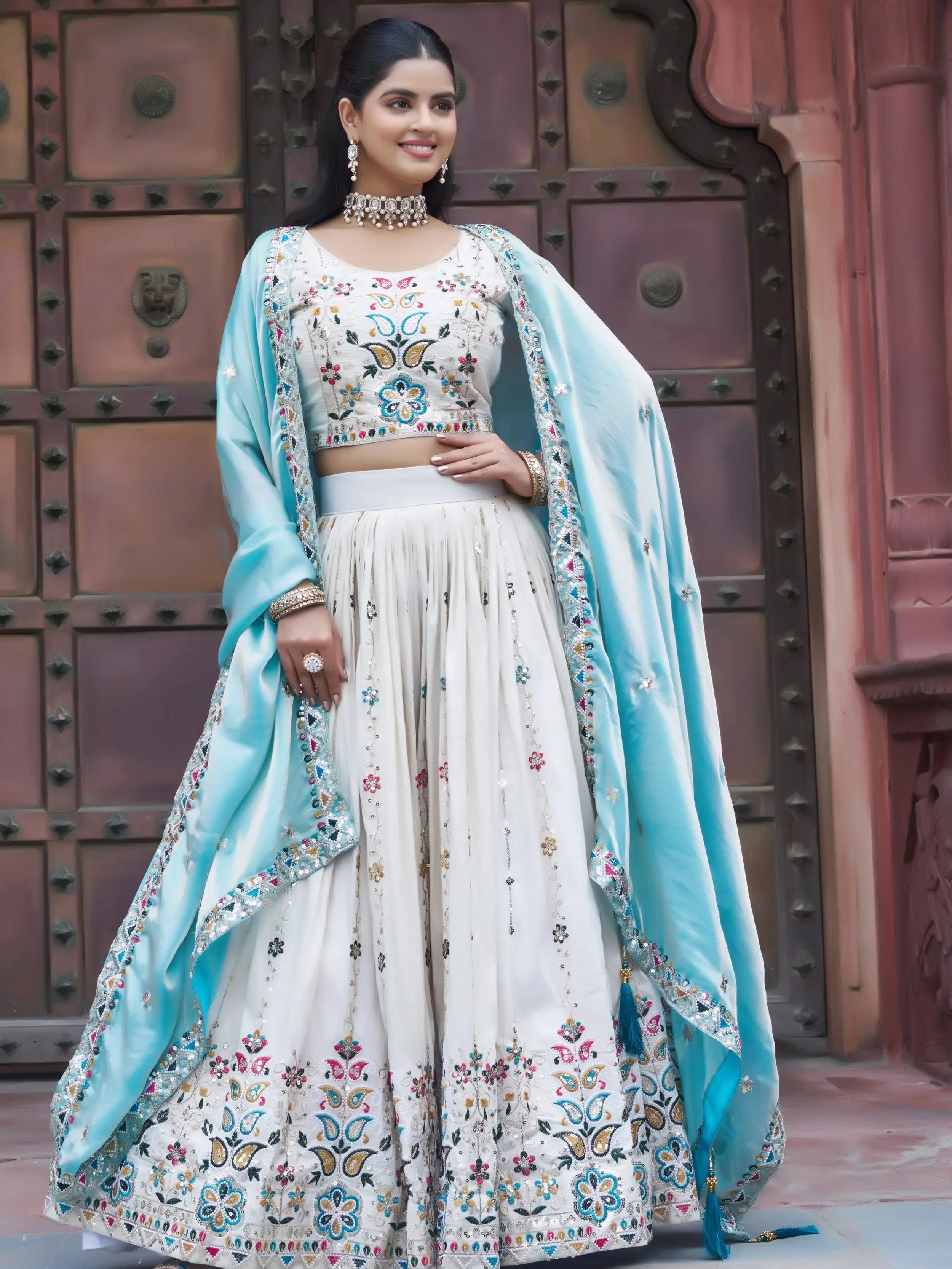 The blouse features coordinating embroidery with vibrant motifs that match the lehenga perfectly, maintaining the same ivory tone. The sky-blue dupatta in pure Fendy fabric is richly bordered with sequins and thread work, completing the look with a refreshing contrast.