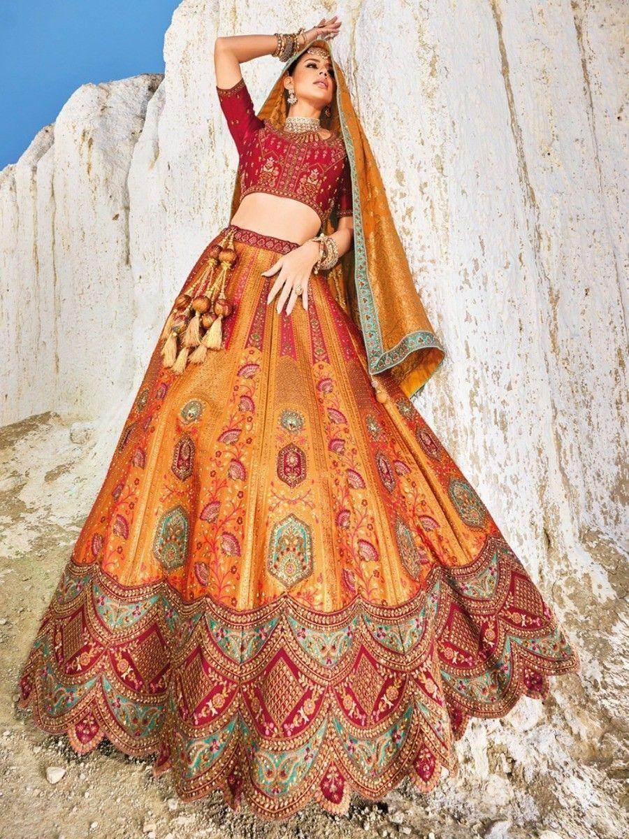 The lehenga is made from a high-quality orange viscose silk material that exudes elegance. It features intricate fancy dori work, stone work, zari weaving work, and multi-thread work, adding a touch of opulence to the overall design. The A-line silhouette offers a flattering shape and enhances your feminine grace.