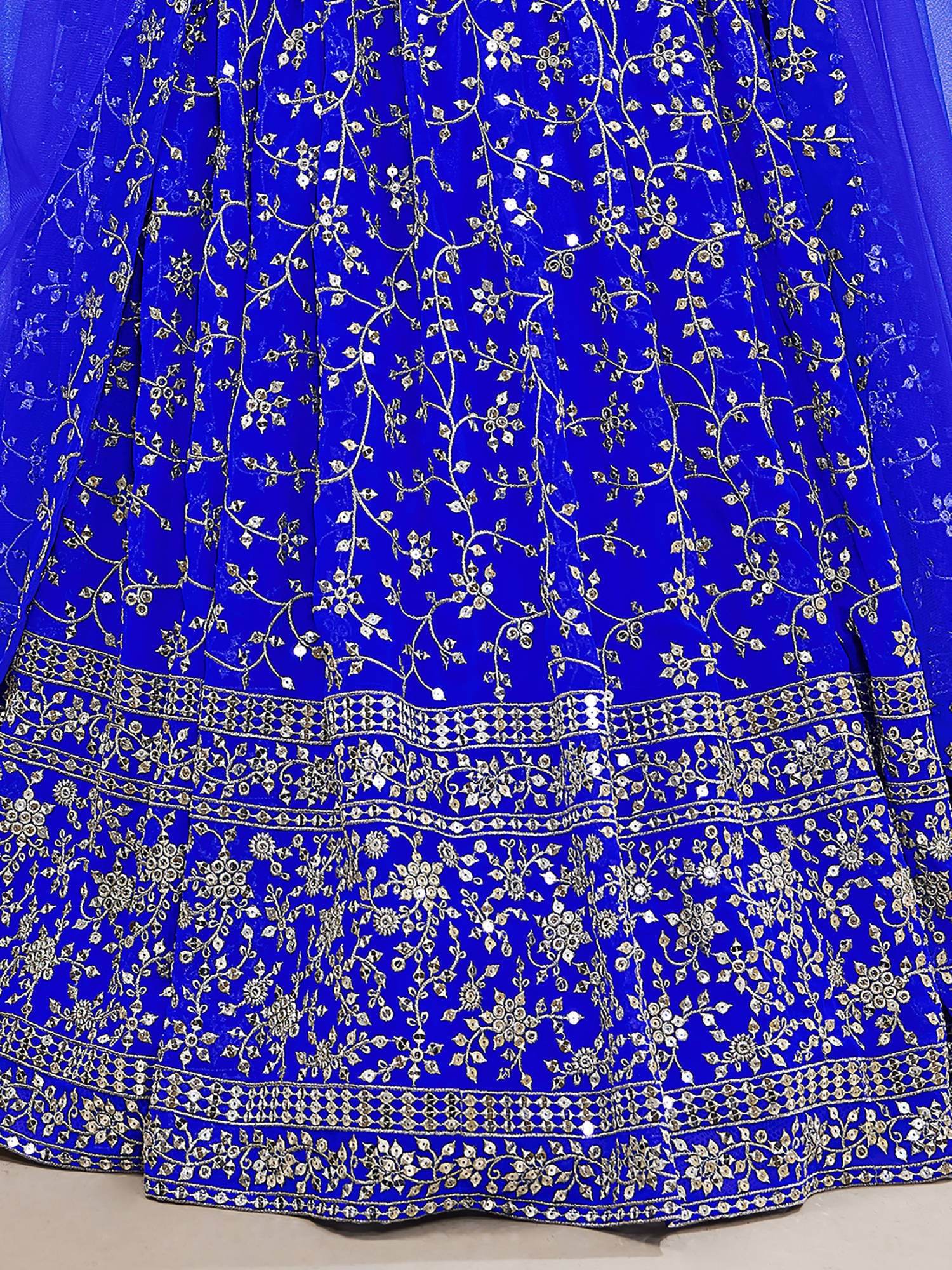 The lehenga features stunning sequin work, zari work, and embroidery work. These intricate details add a touch of glamour and elegance to the overall look. The gorgeous blue color of the lehenga further enhances its beauty and makes it a standout piece.
