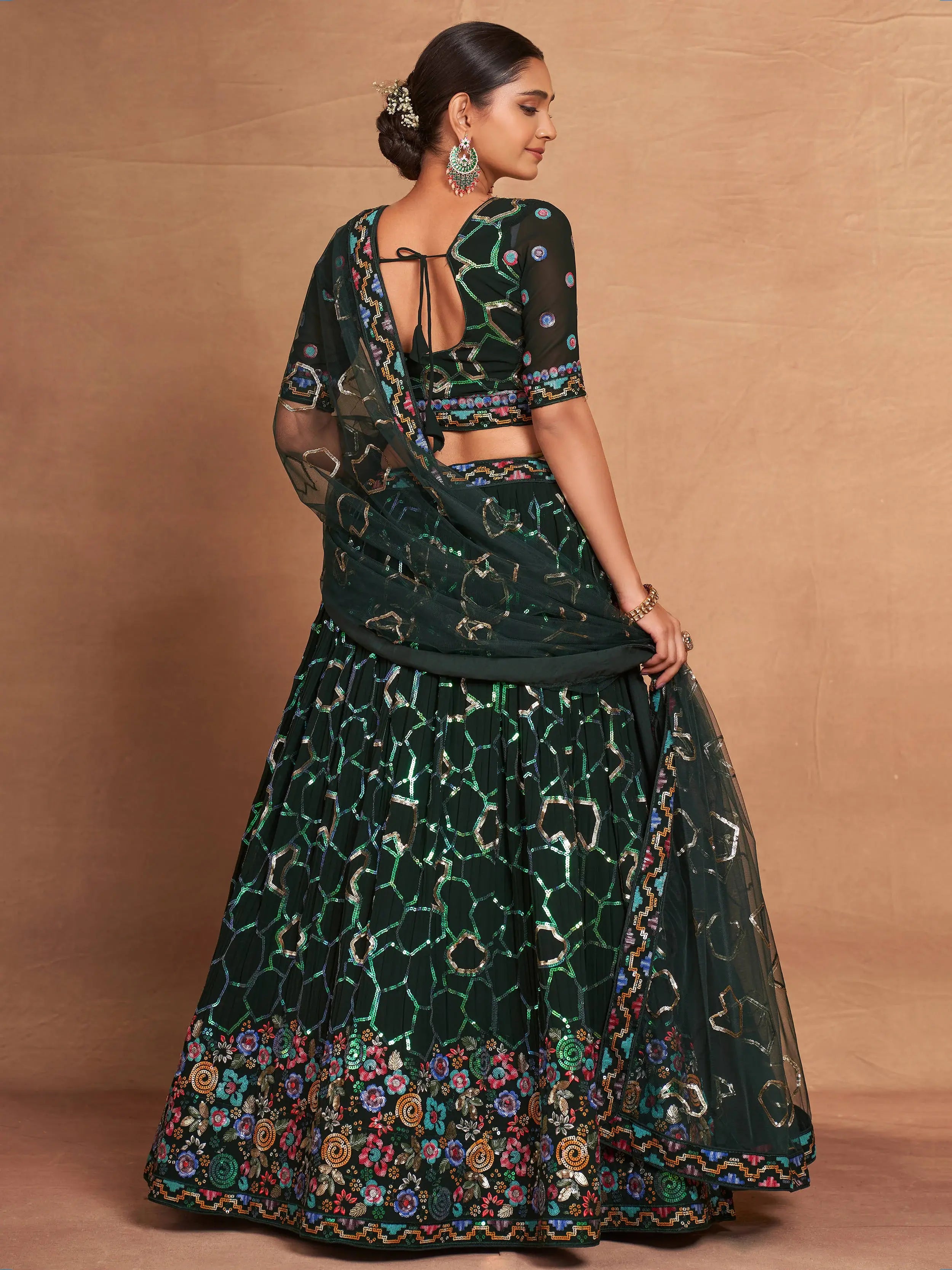 This mesmerizing green sequins georgette mehendi wear lehenga choli is a must-have for anyone who appreciates beauty, elegance, and fine craftsmanship. It is a statement piece that will make you the center of attention and leave a lasting impression. Shop now and experience the latest range of ethnic collections from Ethnic Plus.
