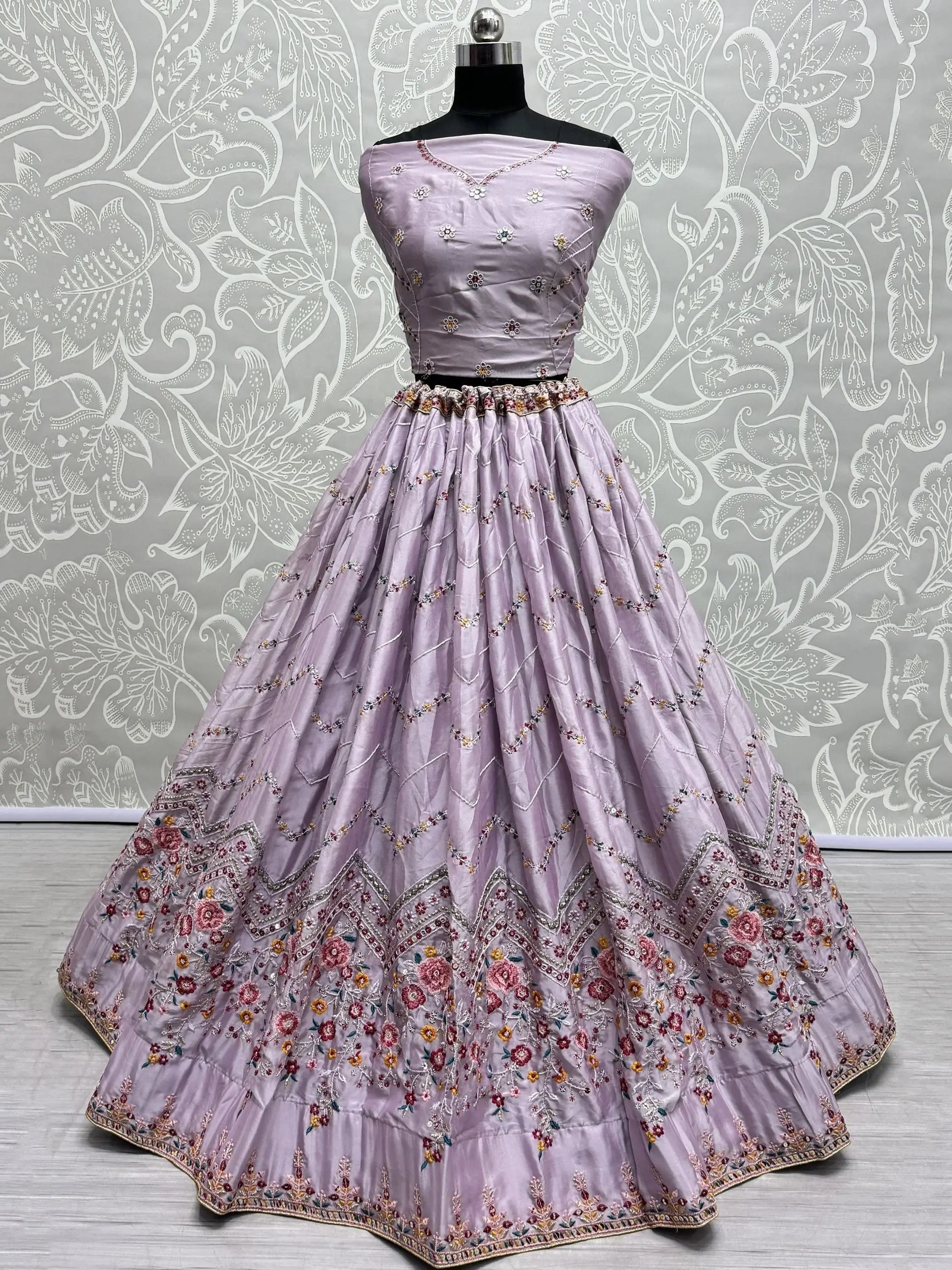 Step into a world of enchantment with this mesmerizing lavender rangoli silk lehenga ensemble, meticulously crafted to epitomize grace and elegance. Adorned with exquisite thread work, shimmering sequins, and intricate zari embroidery, the lehenga exudes an ethereal charm that is bound to leave a lasting impression. Paired with a matching choli crafted from the same luxurious fabric and embellished with similar meticulous detailing, this ensemble radiates sophistication and timeless beauty.