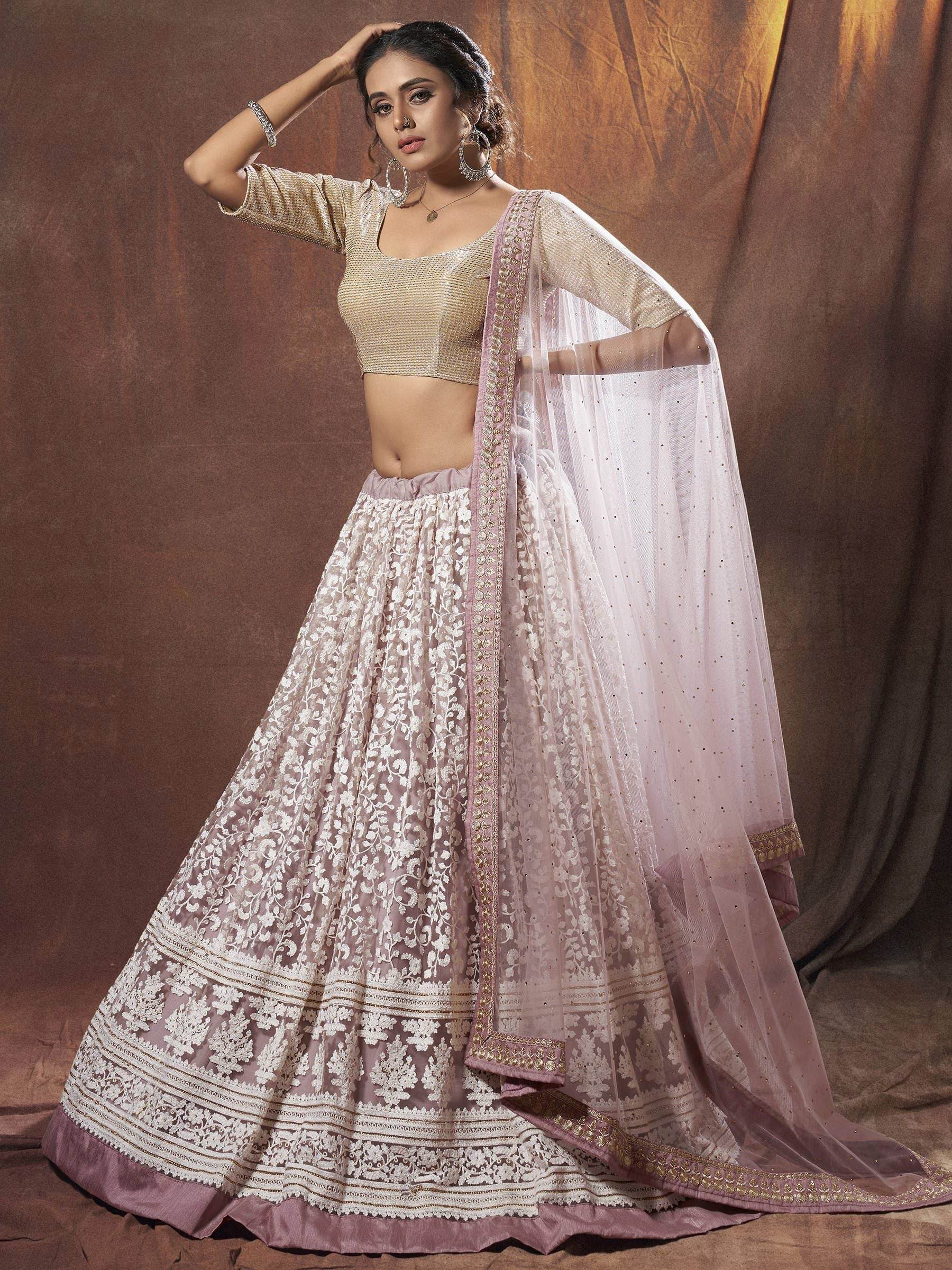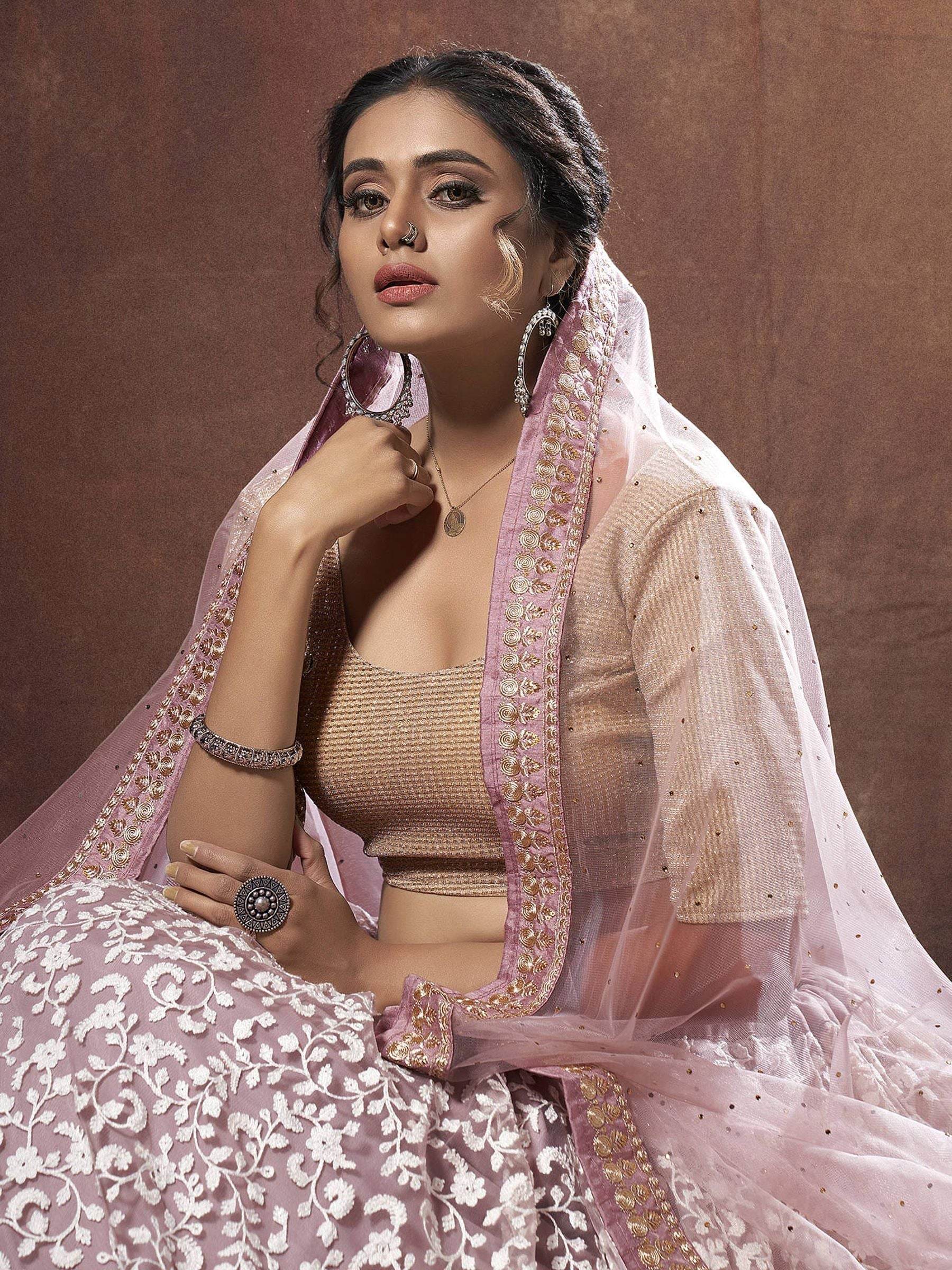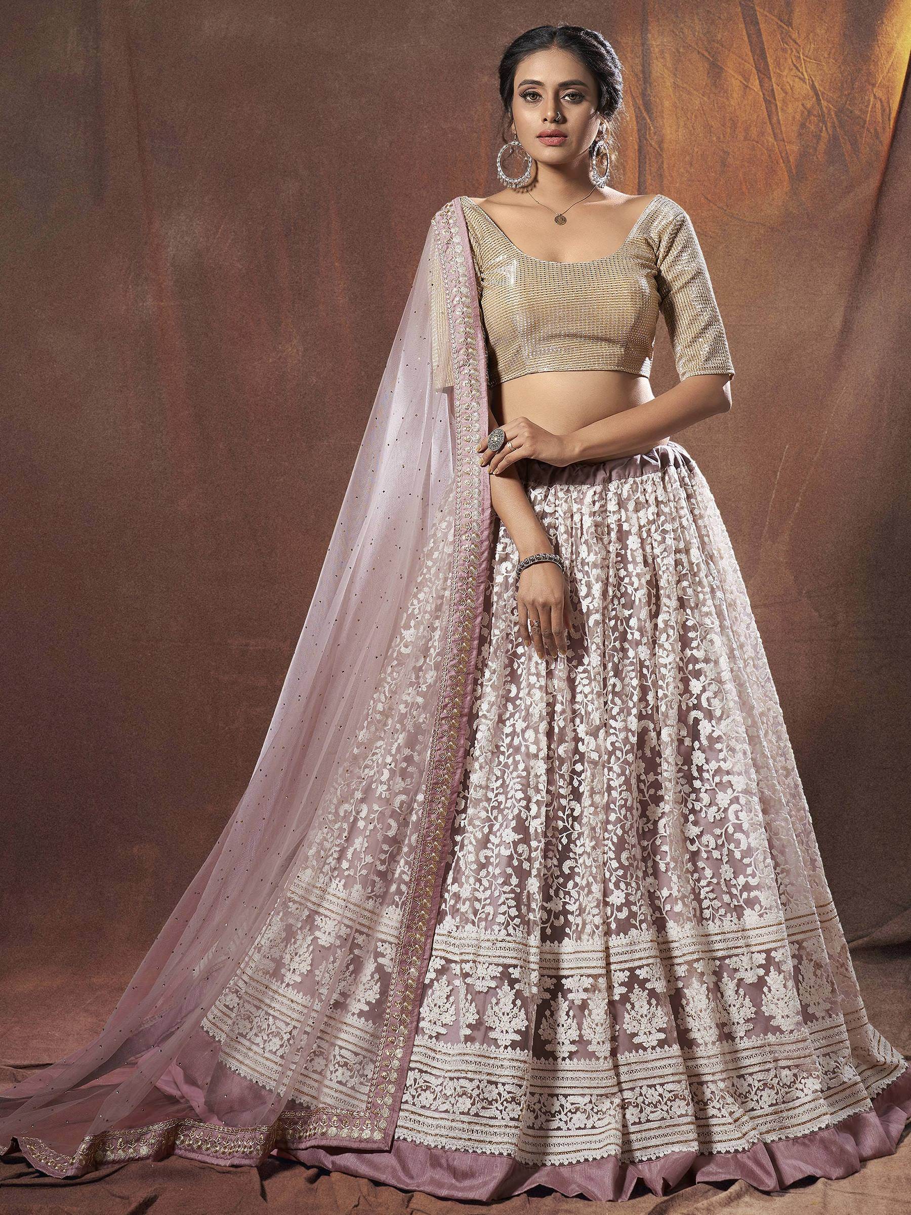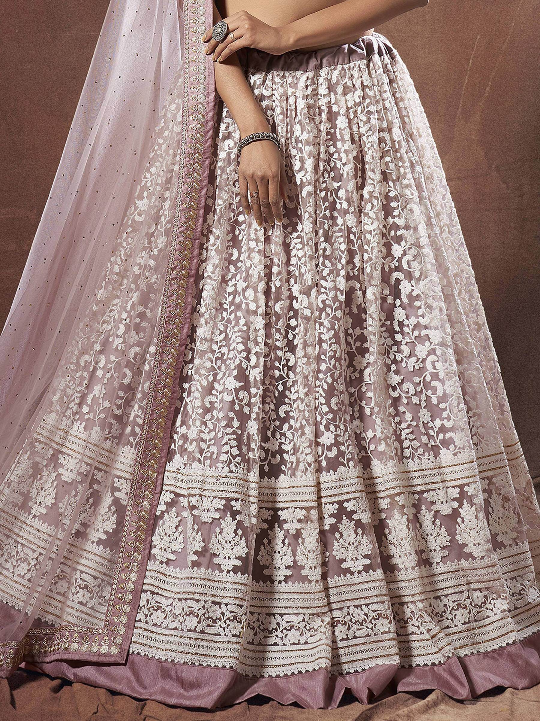 The net lehenga choli is a stunning blend of modern charm and traditional elegance. The soft mauve tone enhances the look with its delicate and graceful appeal.