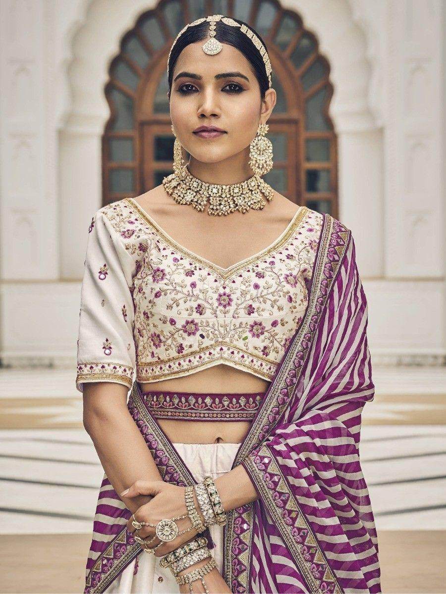 To complete the ensemble, a beautiful purple color organza material dupatta is included. This dupatta features leheriya printed work and a stunning embroidery lace border, adding a pop of color and an extra layer of elegance to the outfit.